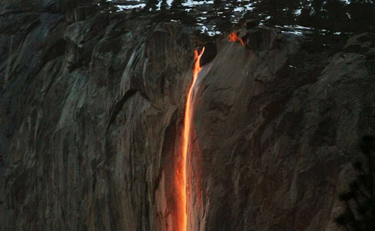 Normalmente el agua fluye sobre la cascada Horsetail Fall en el borde este en El Capitán durante el invierno. En algún momento de febrero, las condiciones climatológicas y el horario perfecto hacen que la caída del agua se convierta en la popular Yosemite Firefall.