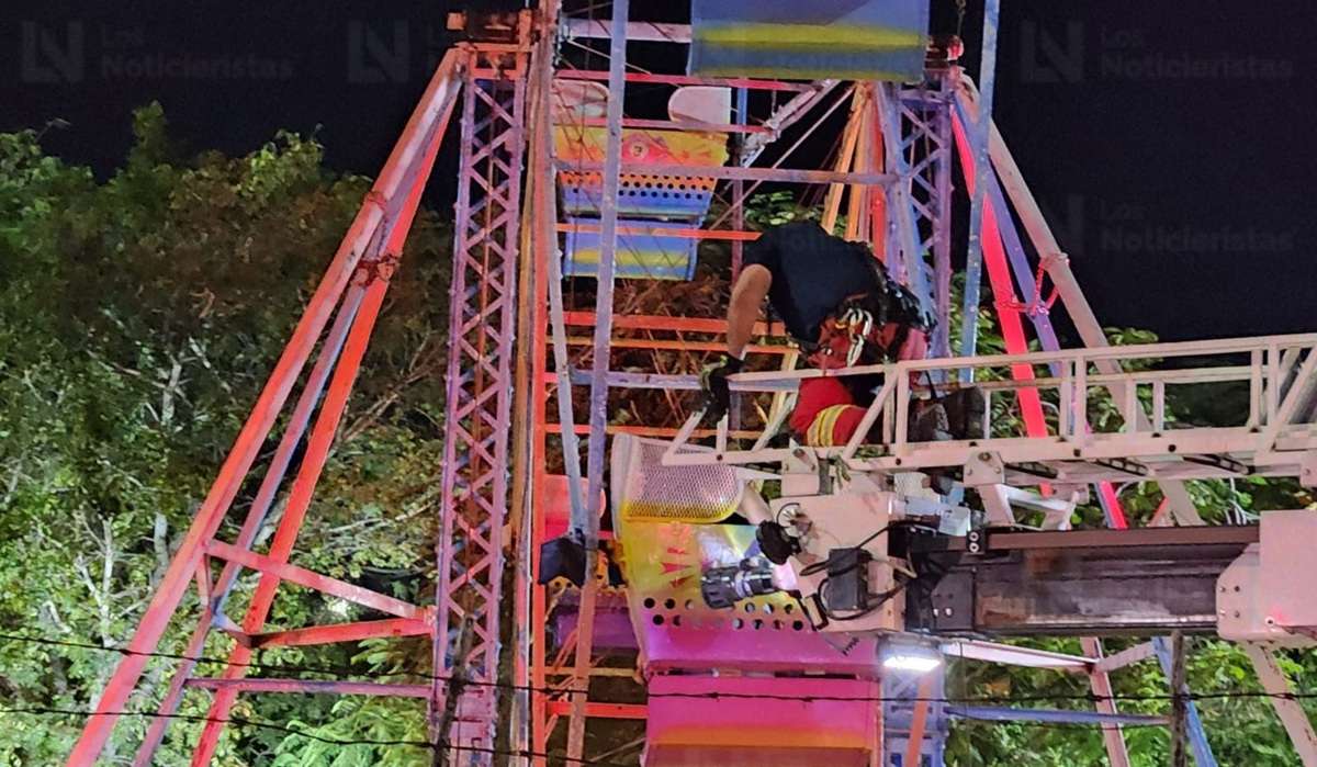 De acuerdo a la información obtenida en el lugar de los hechos, el cable acerado que sirve como banda para que la rueda de la fortuna gire se reventó, por tal motivo la atracción dejó de funcionar y quedaron atrapados 15 usuarios.