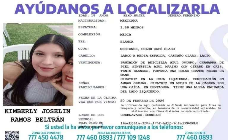 Kimberly, una joven de 18 años y estudiante de la carrera de contaduría, fue vista por última vez el 20 de febrero de 2026 cuando se dirigía a sus clases en Cuernavaca. Tras diez días de desaparición, su cuerpo fue hallado el 2 de marzo en un predio del poblado de Chamilpa, una zona boscosa al norte de la capital del estado.
