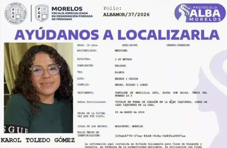 Apenas un día después de que se confirmara la muerte de Kimberly, la comunidad universitaria denunció la desaparición de Karol Toledo Gómez, de 18 años y alumna de la Escuela de Estudios Superiores (EES) de Mazatepec. Karol fue vista por última vez el 2 de marzo.