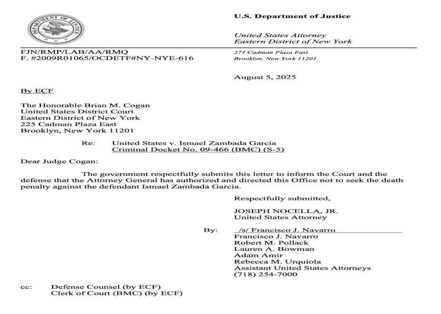 En un documento fechado este martes y dirigido al juez Brian M. Cogan, de la corte del Distrito Este de Brooklyn, en Nueva York, quien lleva el caso de Zambada, el fiscal Joseph Nocella Jr., junto con otros fiscales, como Francisco J. Navarro, Robert M. Pollack, Lauren A. Bowman, entre otros, informan a la Corte y a la defensa del exlíder del Cártel de Sinaloa que “la fiscalía general ha autorizado y determinado no buscar la pena de muerte con el acusado Ismael Zambada García”.