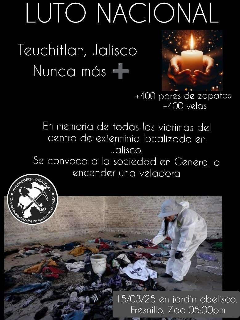 El llamado al luto nacional y la vigilia surge luego del hallazgo revelado el pasado 6 de marzo por el colectivo Guerreros Buscadores de Jalisco sobre un predio en el que se realizaban cremaciones clandestinas, utilizando al menos tres hornos, en el municipio de Teuchitlán, al oeste de Guadalajara.