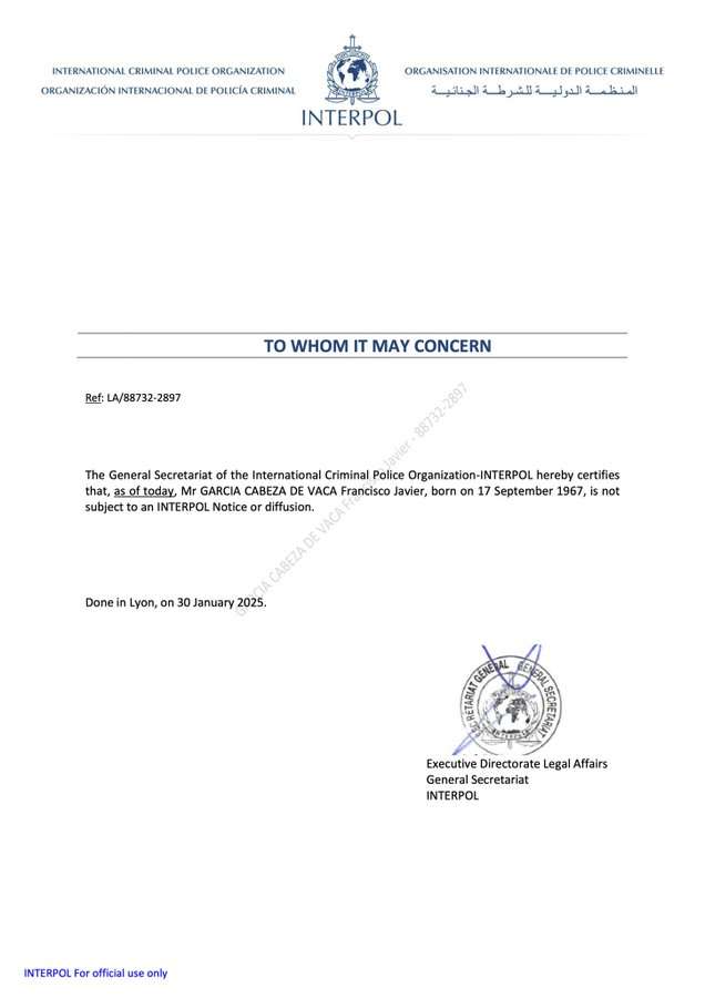 En el documento que Cabeza de Vaca compartió en redes sociales, se le informa que "no es un objetivo para la Interpol".
