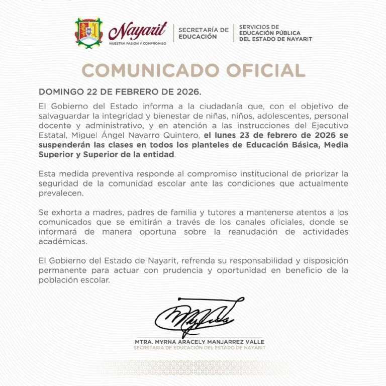 En un comunicado publicado este domingo, los Servicios de Educación Pública del Estado de Nayarit informan que la suspensión de clases aplica en todos los planteles de Educación Básica, Media Superior y Superior.