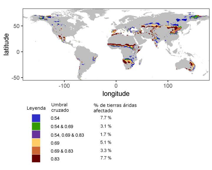 Lo más novedoso quizá de esta investigación es el carácter abrupto de estos cambios de estado identificados con una serie de umbrales de aridez que, una vez pasado, hacen que todo el ecosistema cambie. El estudio detecta tres valores en el camino al desierto: el paso a un grado de aridez de 0,54, otro en el cociente de 0,69 y, ya en la antesala desértica, 0,83.