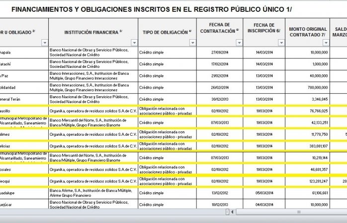 En la descripción los cinco financiamientos se encuentran bajo los siguientes conceptos: Institución Financiera, Organika, Operadora de Residuos Sólidos SA de CV; Tipo de Obligación, Relacionada con Asociaciones Público – Privadas; Fecha de Contrato, 02/10/2012; Fecha de Inscripción, 11/03/2014; Plazo Pactado, 240 meses (7,305 días); Destino, inversión pública productiva.