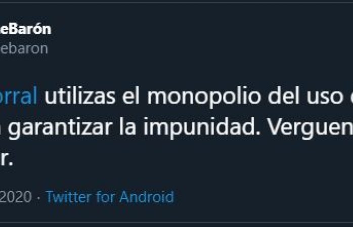 “@Javier_Corral Nuestra familia te hace responsable por los crímenes que se cometen en este momento por barzones en La Mojina. Peniche ni contesta el teléfono”, dice el twitt.