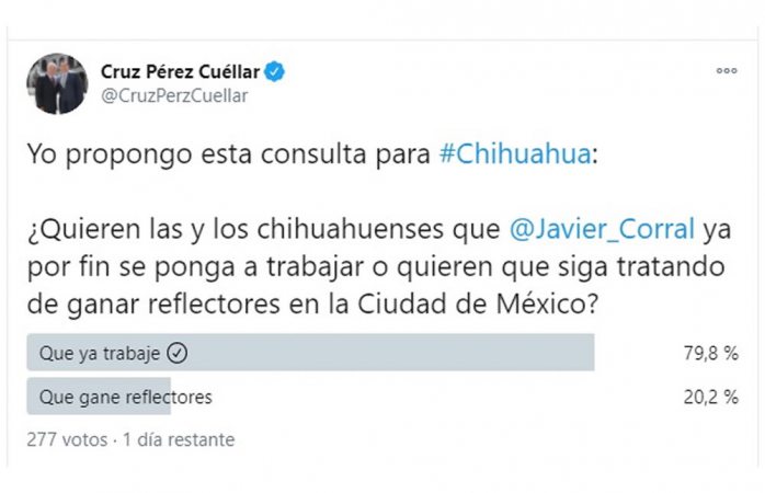 “Yo propongo esta consulta para Chihuahua”, escribió, con las opciones de que el gobernador Javier Corral “Ya por fin se ponga a trabajar” o “que siga tratando de ganar reflectores en la Ciudad de México”.
