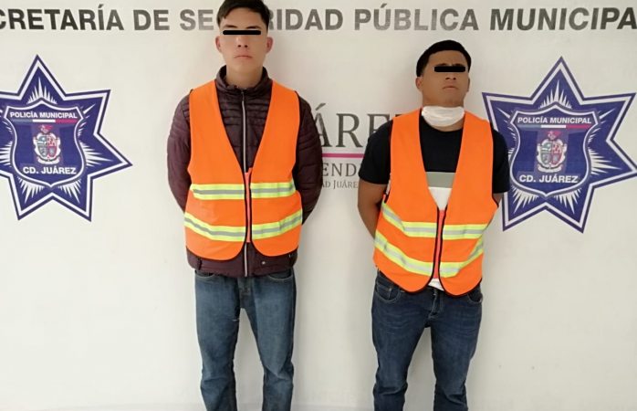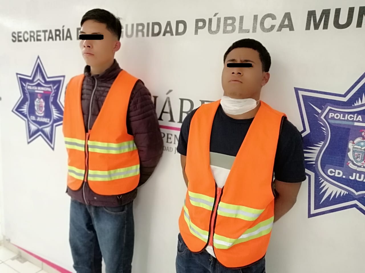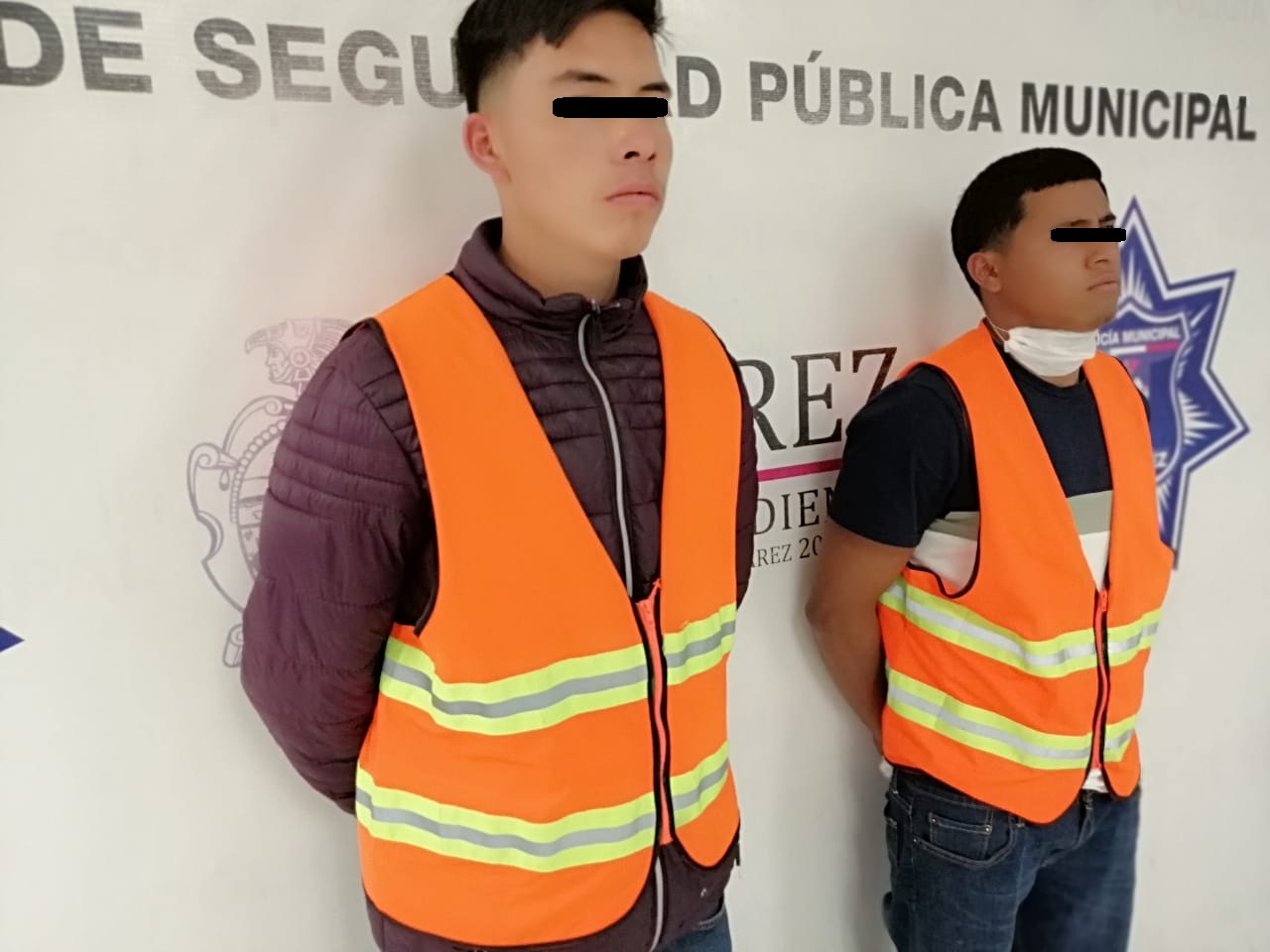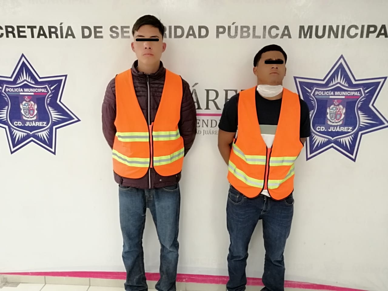 Juárez.- Agentes de la Secretaría de Seguridad Pública Municipal realizaron el arresto de Brian V. T. y César Rubén V. T., por su presunta responsabilidad en la comisión del delito de daños a vehículo automotor al ser señalados plenamente de haber incendiado una camioneta durante la madrugada de hoy.