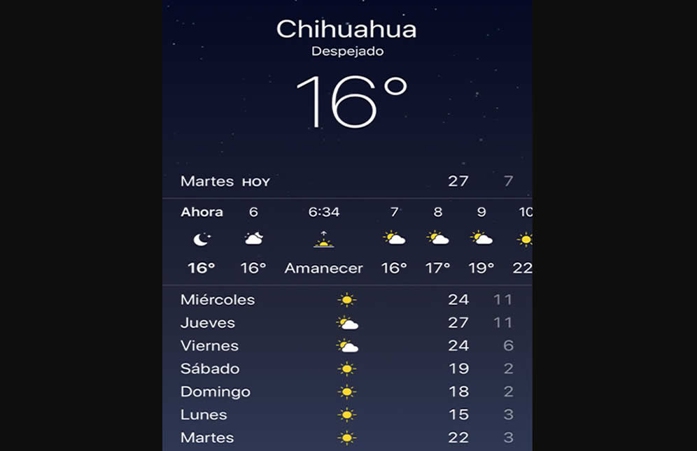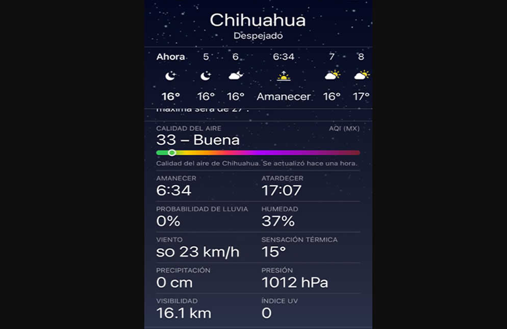 Chihuahua.- Vientos de 23 kilómetros por hora se registraron al iniciar este día de acuerdo con el servicio meteorológico de los teléfonos iphone.