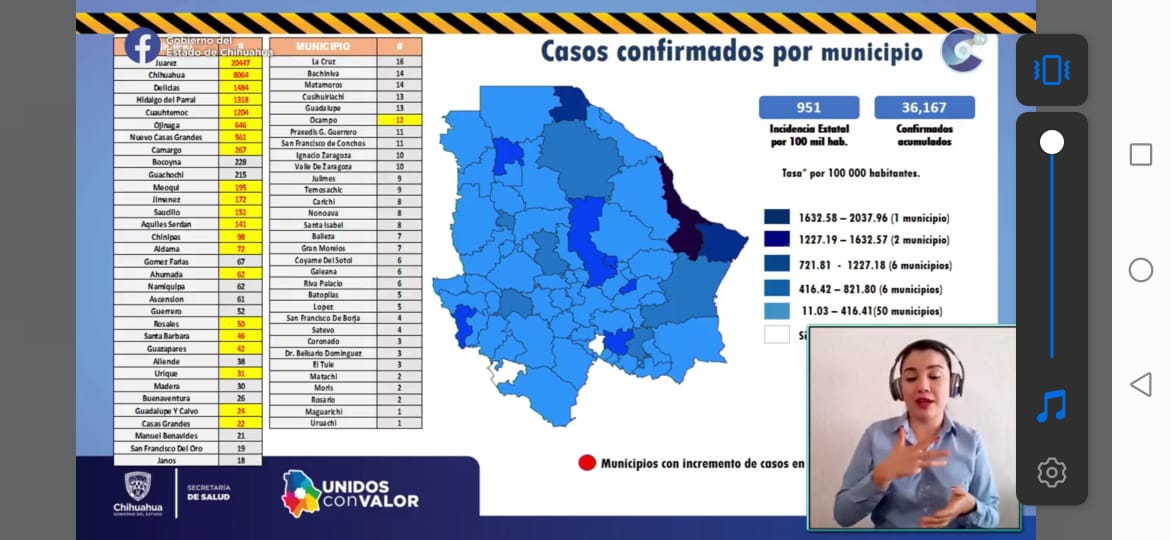 Por consiguiente, la cifra oficial de contagios de coronavirus en el estado se elevó a 36 mil 167, siendo Juárez, Chihuahua, Delicias, Parral y Cuauhtémoc los municipios con más casos confirmados.