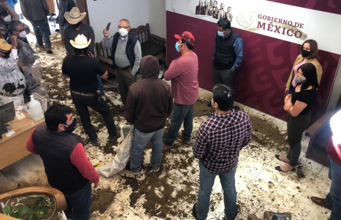 Chihuahua.- Agricultores lanzaron estiércol en las oficinas del bienestar ubicadas sobre la avenida Pacheco y Degollado para exigir el pago de la leche entregada al gobierno federal.