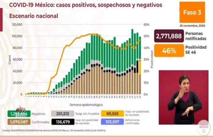 Ciudad de México.- De acuerdo al informe diario sobre la incidencia de COVID-19 en México, en la conferencia número 266, las autoridades de Salud federales dieron a conocer que en nuestro país al día de hoy existen 1" 070 mil 487 de casos positivos a coronavirus y un total de 103 mil 597 decesos, para un acumulado de 2" 771 mil 888 pruebas aplicadas al día de hoy.