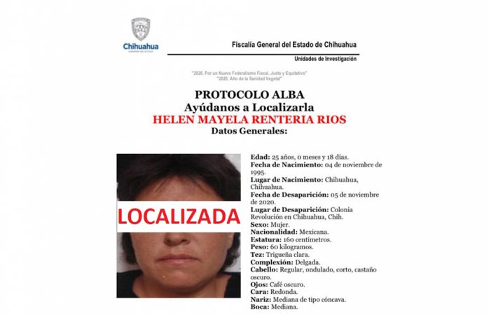 Chihuahua.- Tras 20 días de búsqueda ininterrumpida, la Fiscalía Especializada de la Mujer localizó en buen estado de salud a la C. Helen Mayela Rentería Ríos, vista por última ocasión en la Colonia Revolución en la Ciudad de Chihuahua.