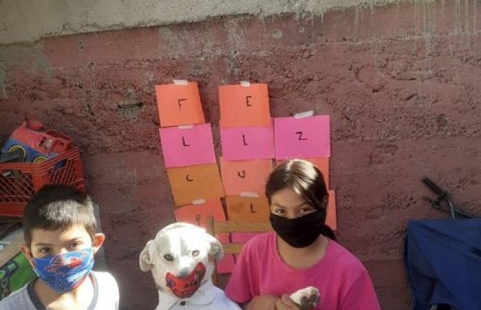 Los niños Juan Pablo y Paola Patricia decidieron festejar el cumpleaños de su mascota de una manera peculiar y tomando las medidas adecuadas de higiene como lo es el uso de cubrebocas, el canino portó el suyo.