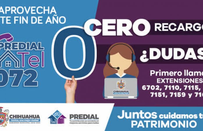 Chihuahua.- El Gobierno Municipal a través de Tesorería invita a la ciudadanía a aprovechar el descuento del 100 por ciento de recargos en el Impuesto Predial, el cual estará vigente hasta el 31 de diciembre.
