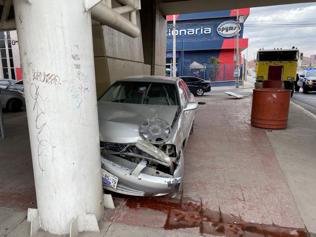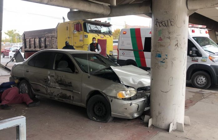 Chihuahua.-Una mujer resultó con lesiones de consideración esta mañana, cuando el auto que conducía chocó contra el pilar de un puente peatonal, tras salir proyectado luego de un golpe que le dio un dompe.