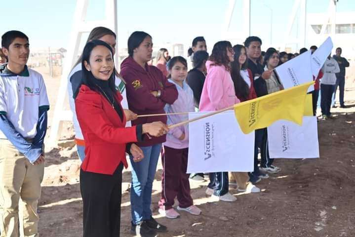 Ascensión.- La alcaldesa Ivonne De La Hoya Venzor, abanderó el arranque para la construcción de la cancha de usos múltiples en el Cecytech #15.
