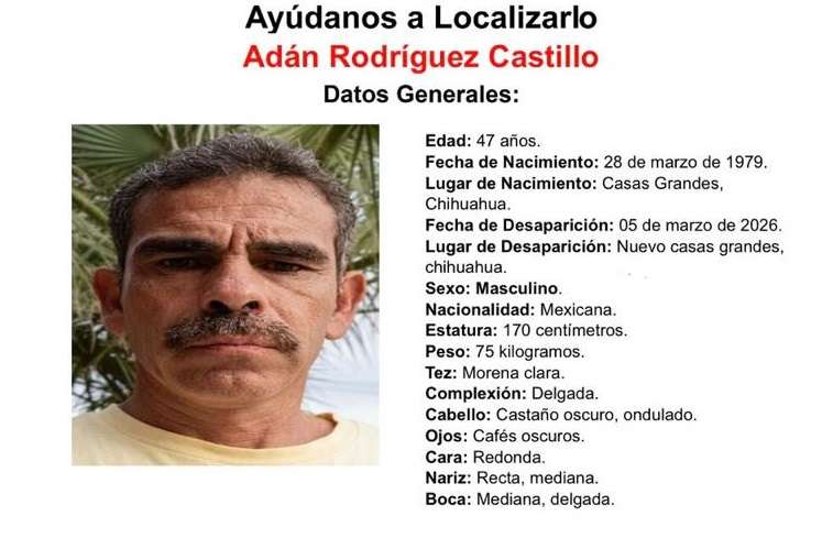 Nuevo Casas Grandes, Chih. - La Fiscalía General del Estado de Chihuahua solicita la colaboración de la ciudadanía para localizar a Adán Rodríguez Castillo, de 47 años de edad, quien se encuentra desaparecido desde hace más de un mes. Según el reporte oficial, se le vio por última vez el pasado 05 de marzo de 2026 en la ciudad de Nuevo Casas Grandes, Chihuahua, y desde ese momento se desconoce su paradero.