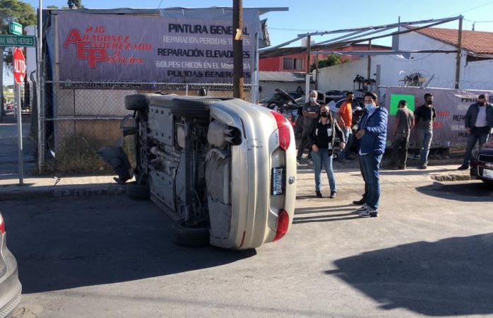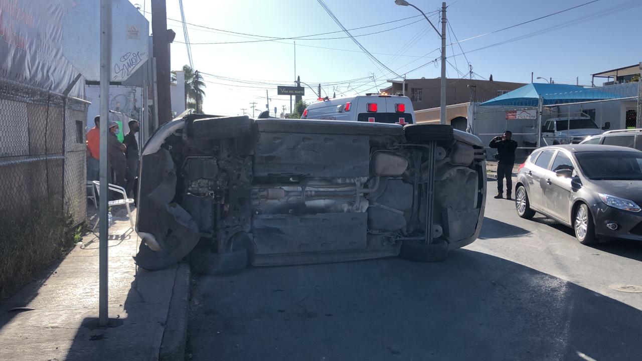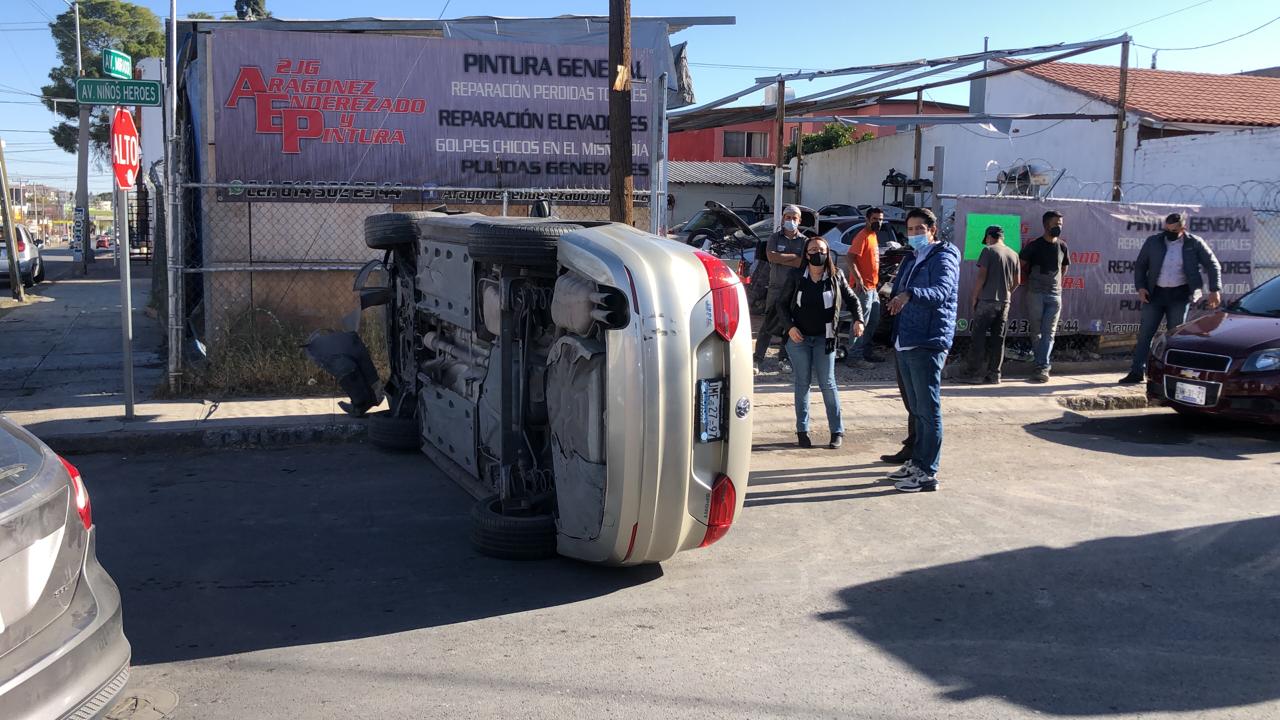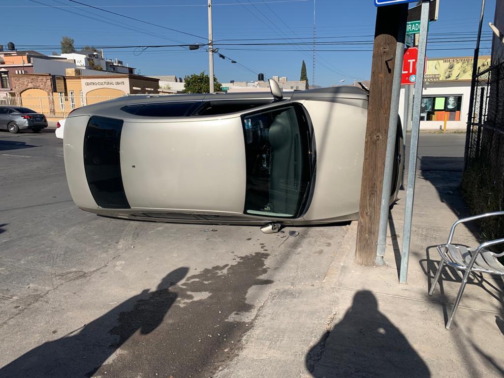 La conductora del Jetta intentaba dar vuelta hacia su derecha sobre la calle Niños Héroes, debido al fuerte impacto el automóvil terminó volcado de un costado.