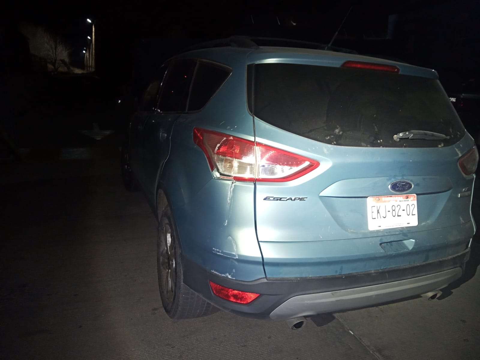 Fue asegurada la placa metálica trasera de circulación del Estado de Chihuahua EKJ 8202, y un vehículo Ford Escape en color verde, con número de serie 1 FM CU0GX3DUB 63658