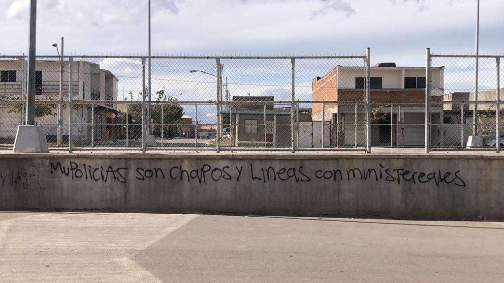 Chihuahua.- Luego del hallazgo de dos narcomantas localizadas anoche en puentes, así como una pinta en una barda, se encontró otra narco pinta en la base de unas canchas en Vistas Cerro Grande.
