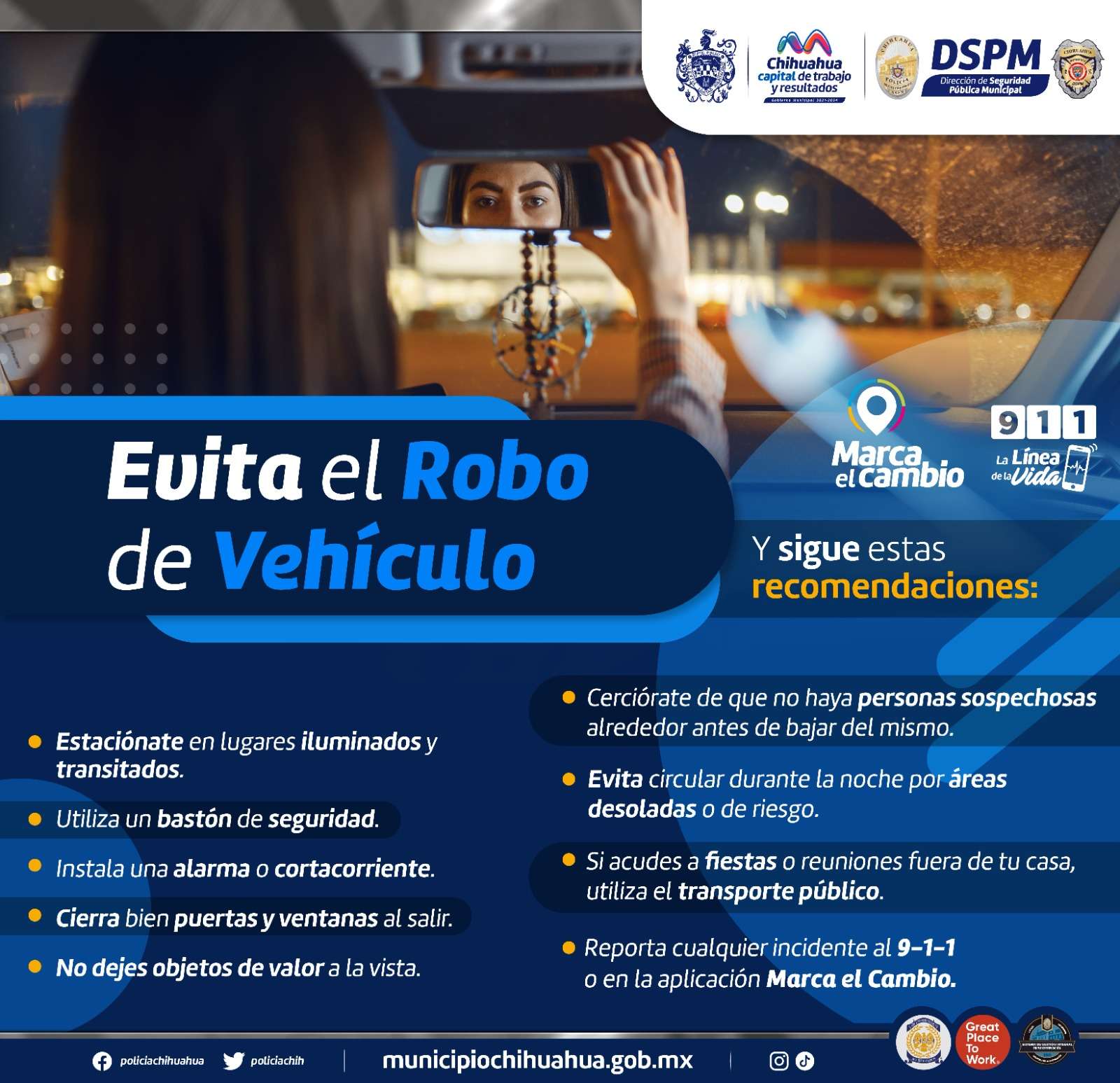Chihuahua, Chih.- A fin de inhibir el robo de automóviles o de pertenencias del interior de estos, el Gobierno Municipal, a través de la Dirección de Seguridad Pública, emite recomendaciones para evitar que amantes de lo ajeno lleven a cabo estos delitos, pues a pesar de que se mantienen recorridos constantes de prevención y vigilancia por parte de la Policía Preventiva, es importante que cada persona tome medidas de autocuidado.