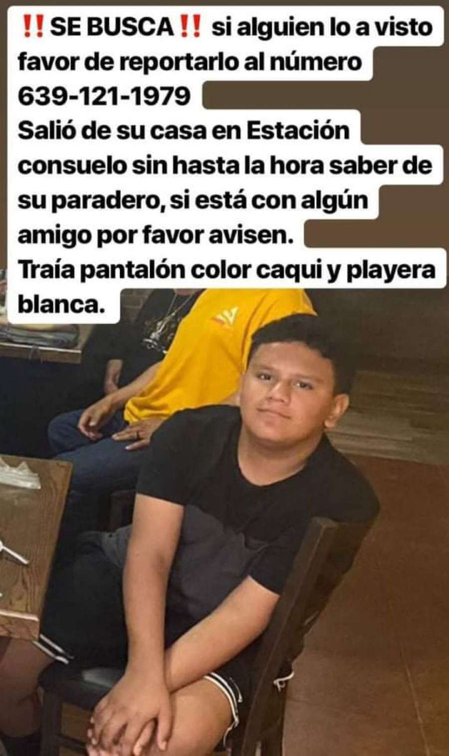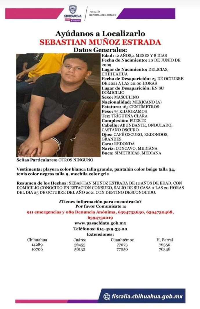 Delicias.- Se solicitó el apoyo de los ciudadanos para dar con el paradero del menor Sebastián Muñoz Estrada, quien salió de su domicilio en estación consuelo el día 25 de octubre a las 20 hrs.
