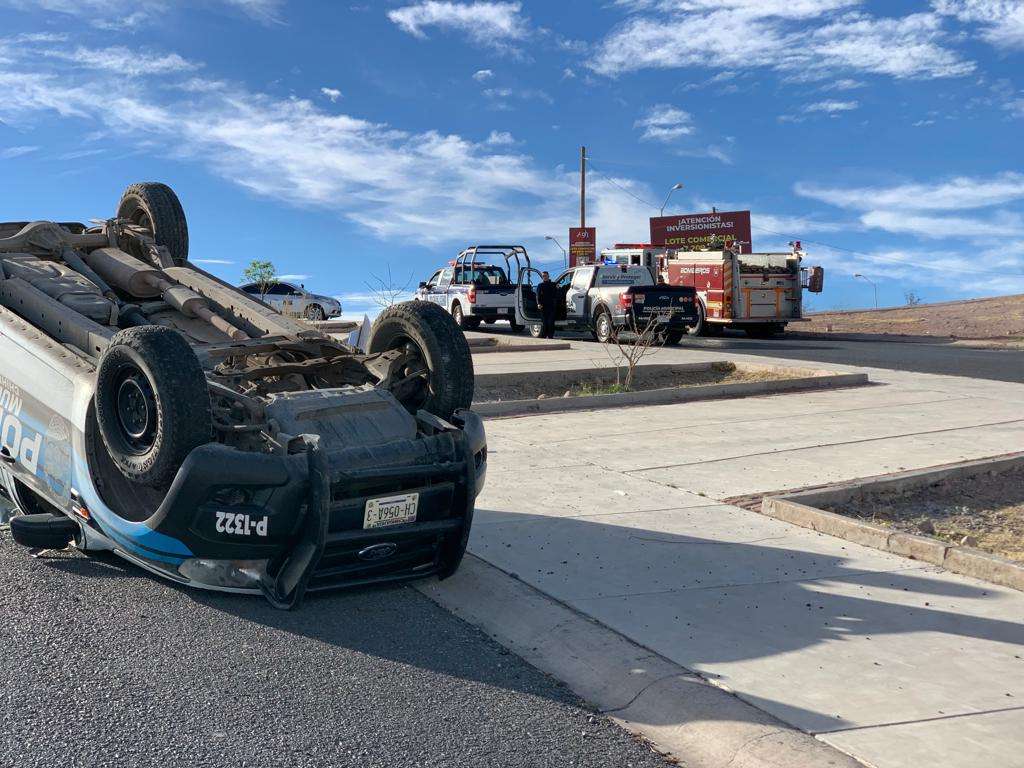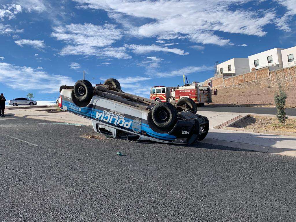 Los hechos ocurrieron en el cruce de las calles Paseos de Universidad y Arroyo Jacales, en donde una patrulla de Policía Municipal circulaba por una glorieta perdiendo el control, saliendo del camino e impactando contra un montículo de tierra terminado volcado completamente de cabeza.
