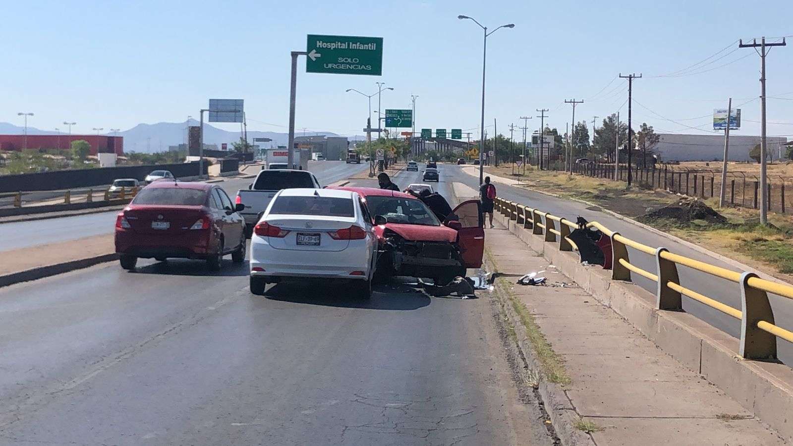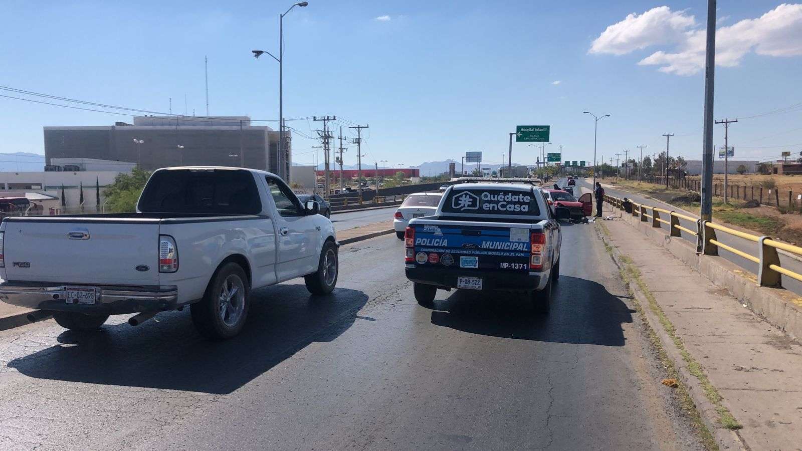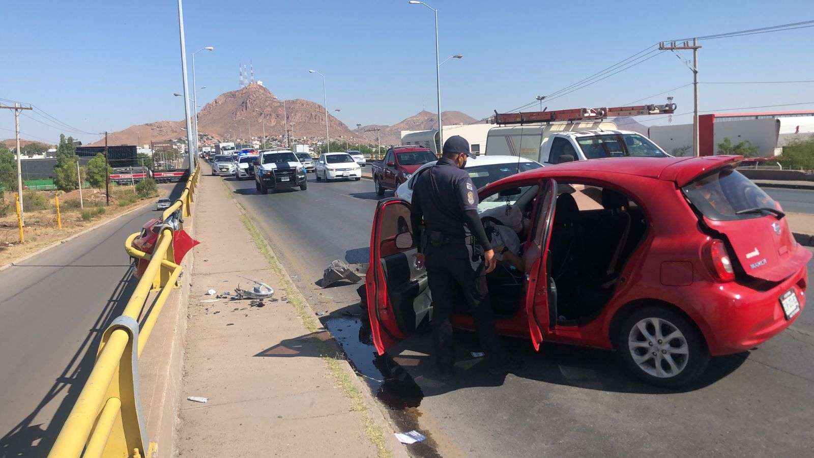 Chihuahua.- Se registró un fuerte choque donde una conductora impactó su vehículo contra el muro de contención del puente de la avenida Pacheco, resultando lesionada.