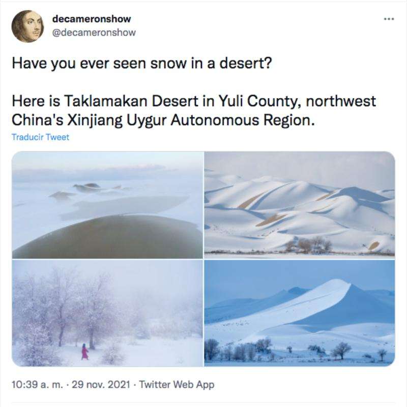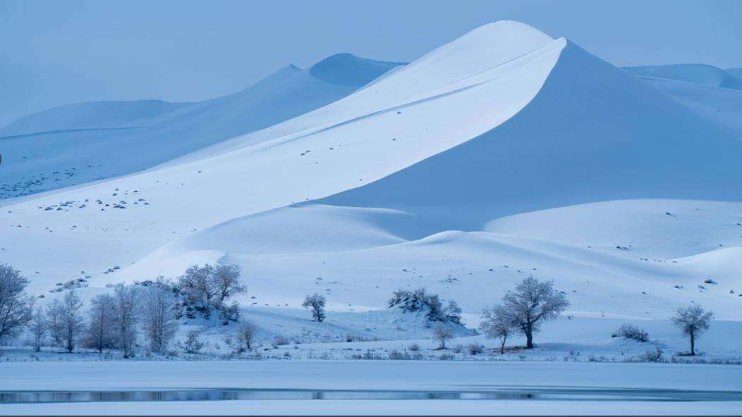 Una rara e inesperada nevada cubrió el desierto ubicado en la región autónoma uigur de Xinjiang, al noroeste de China, creando vistas pintorescas y preciosos paisajes.