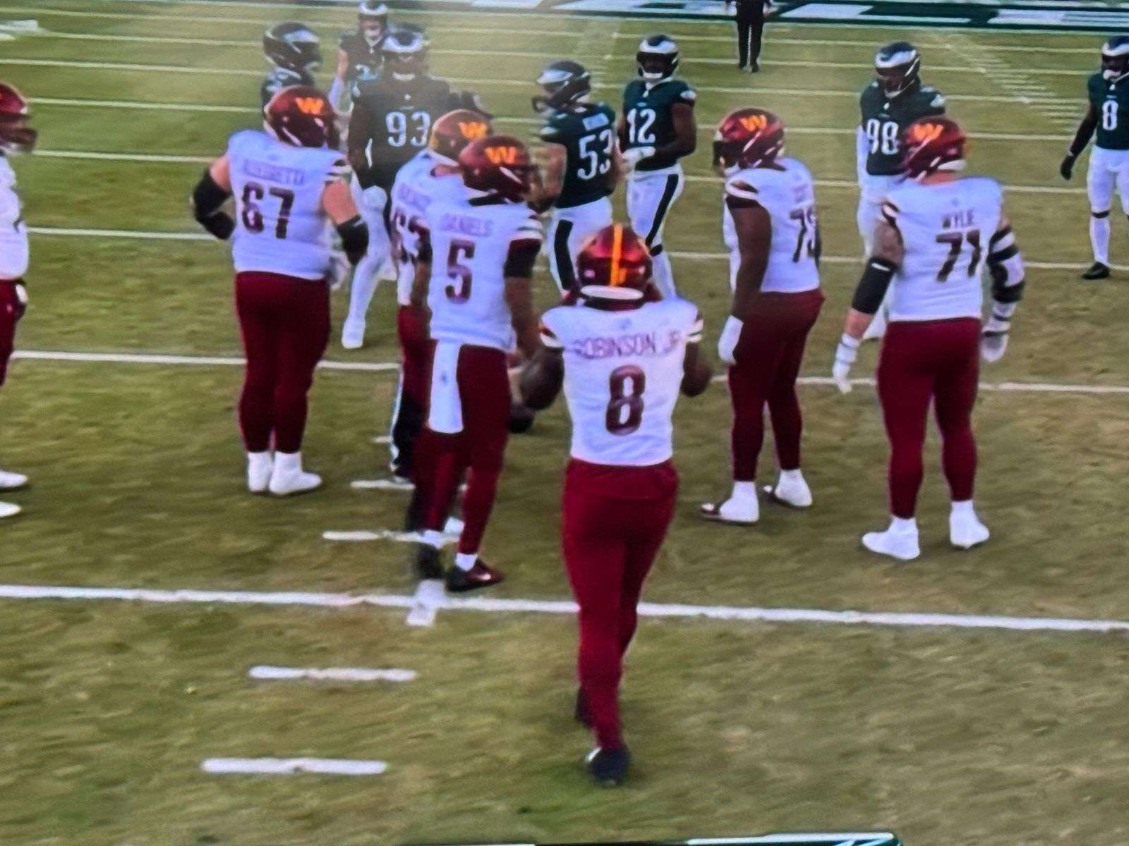 El juego comenzó con un fuerte arranque por parte de Washington. Brian Robinson Jr. anotó un impresionante touchdown de 18 yardas en el primer cuarto, poniendo a los Commanders al frente. Sin embargo, Philadelphia respondió con un avance significativo de 31 yardas por parte de Dallas Goedert y, tras un fumble de Goedert, Grant Calcaterra recuperó el balón y se lo entregó a su equipo. Tres jugadas más tarde, Barkley anotó el primer touchdown para los Eagles.