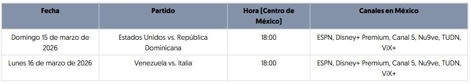 El encuentro entre Estados Unidos y República Dominicana abre la ronda de semifinales el domingo 15 de marzo, mientras que Venezuela e Italia se enfrentan el lunes 16 en busca del segundo boleto a la final del torneo internacional.