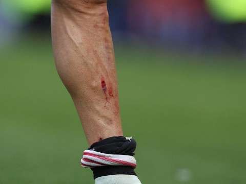 El luso se bajó la calceta y mostró las dos heridas que le causó la jugada.
