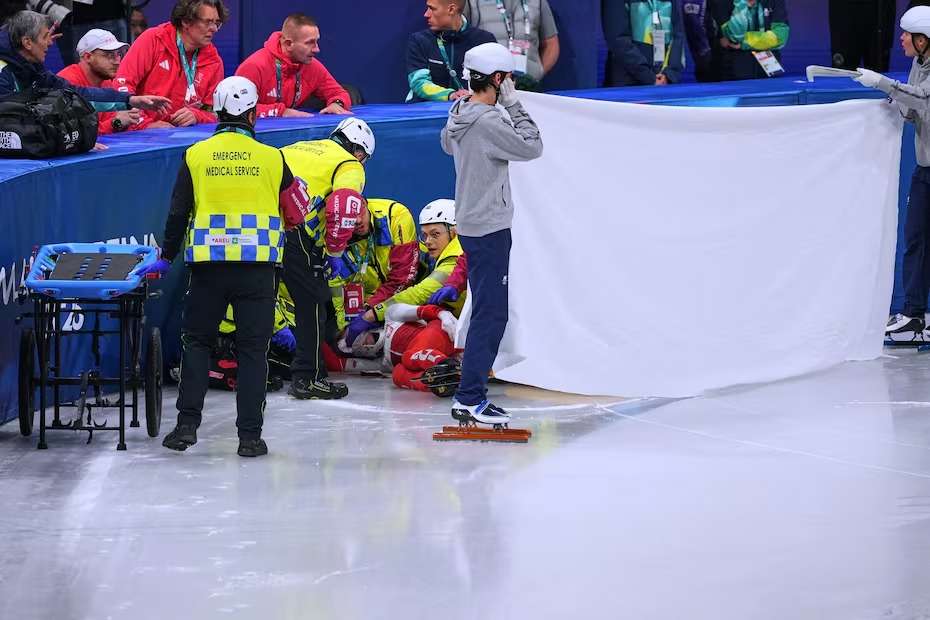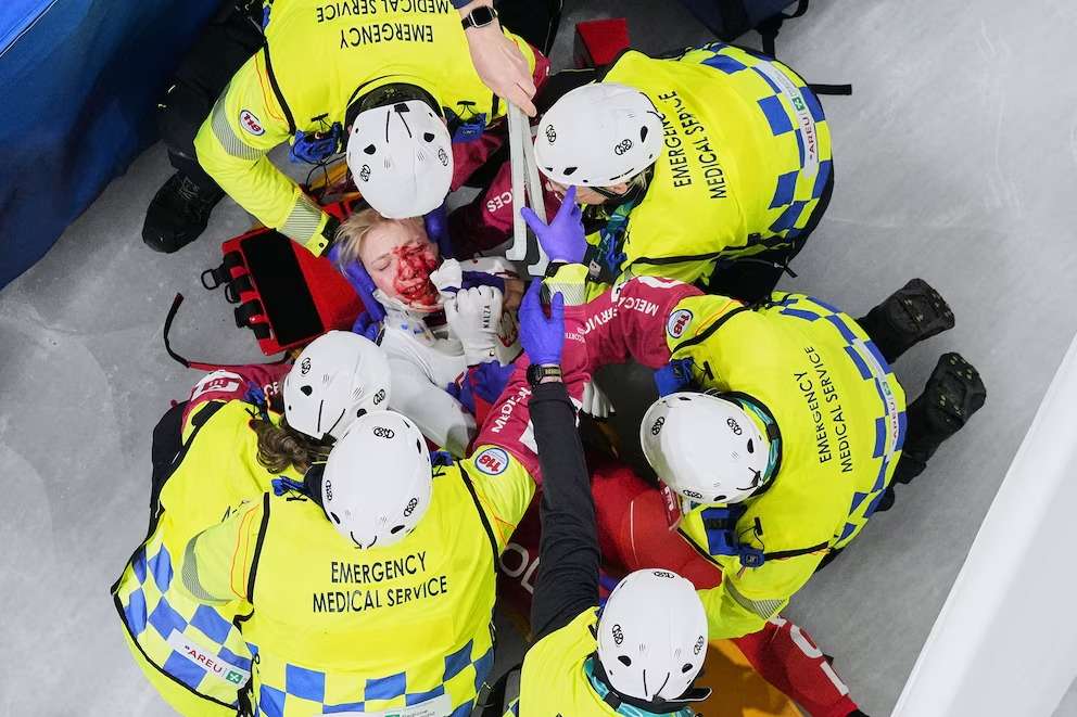 La tensión en el Milano Ice Skating Arena, recinto que cobijó esta disciplina en los Juegos Olímpicos de Milán-Cortina d’Ampezzo, escaló. Las autoridades sanitarias entraron rápidamente al lugar y la sacaron en camilla, mientras las imágenes mostraron la sangre en la zona. Antes de trasladarla, taparon el sector con una gran sábana blanca mientras la atendían.