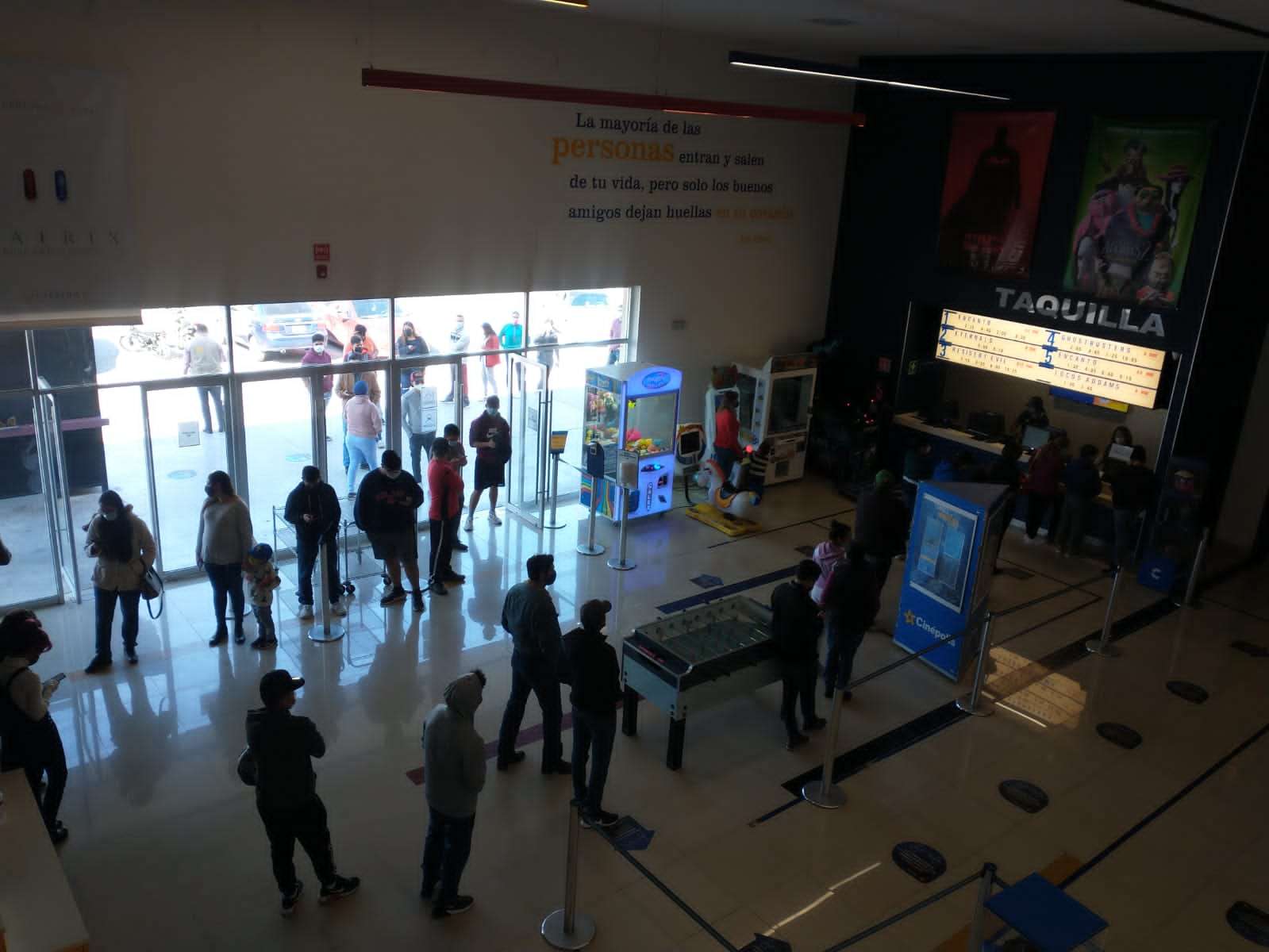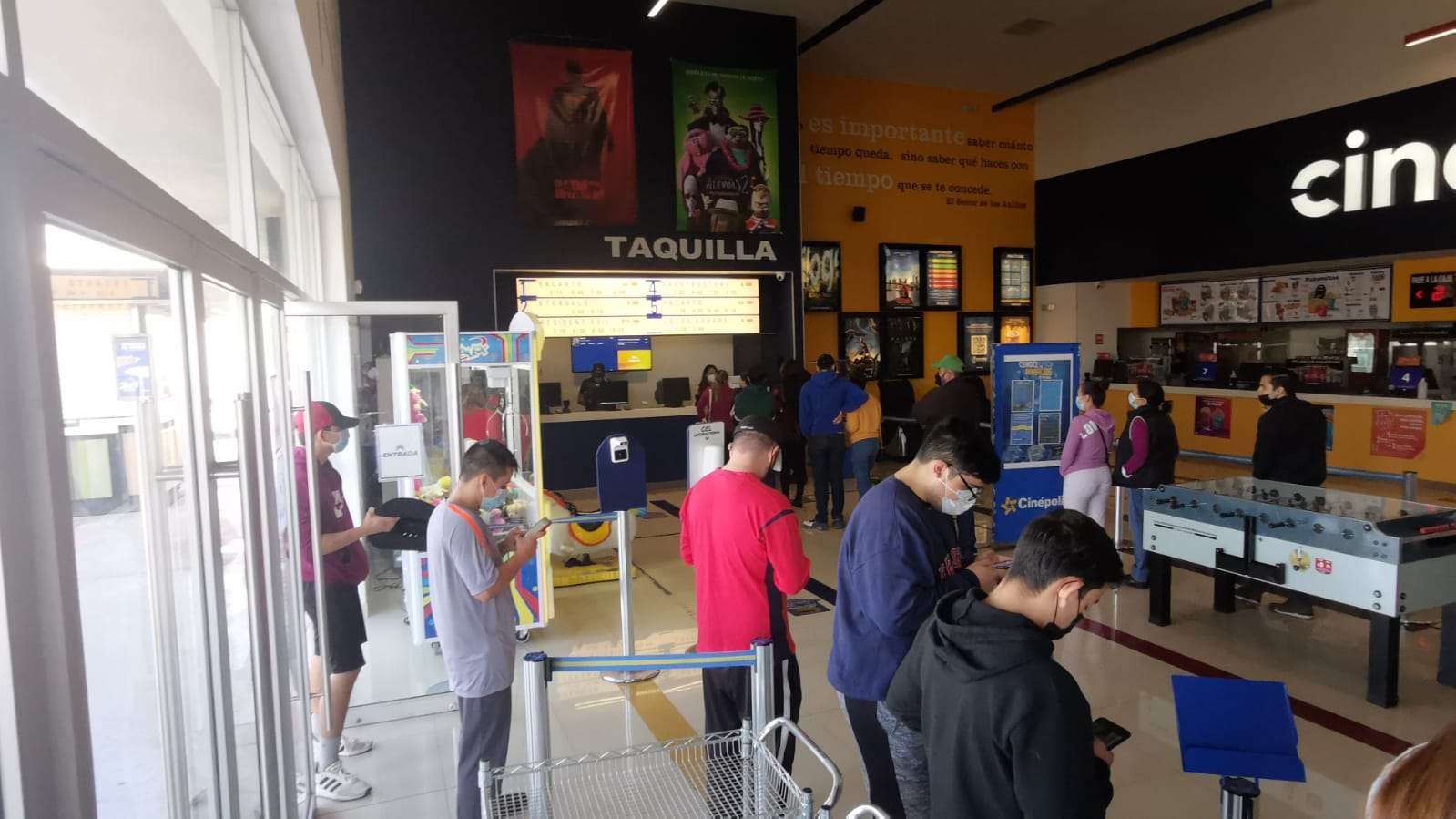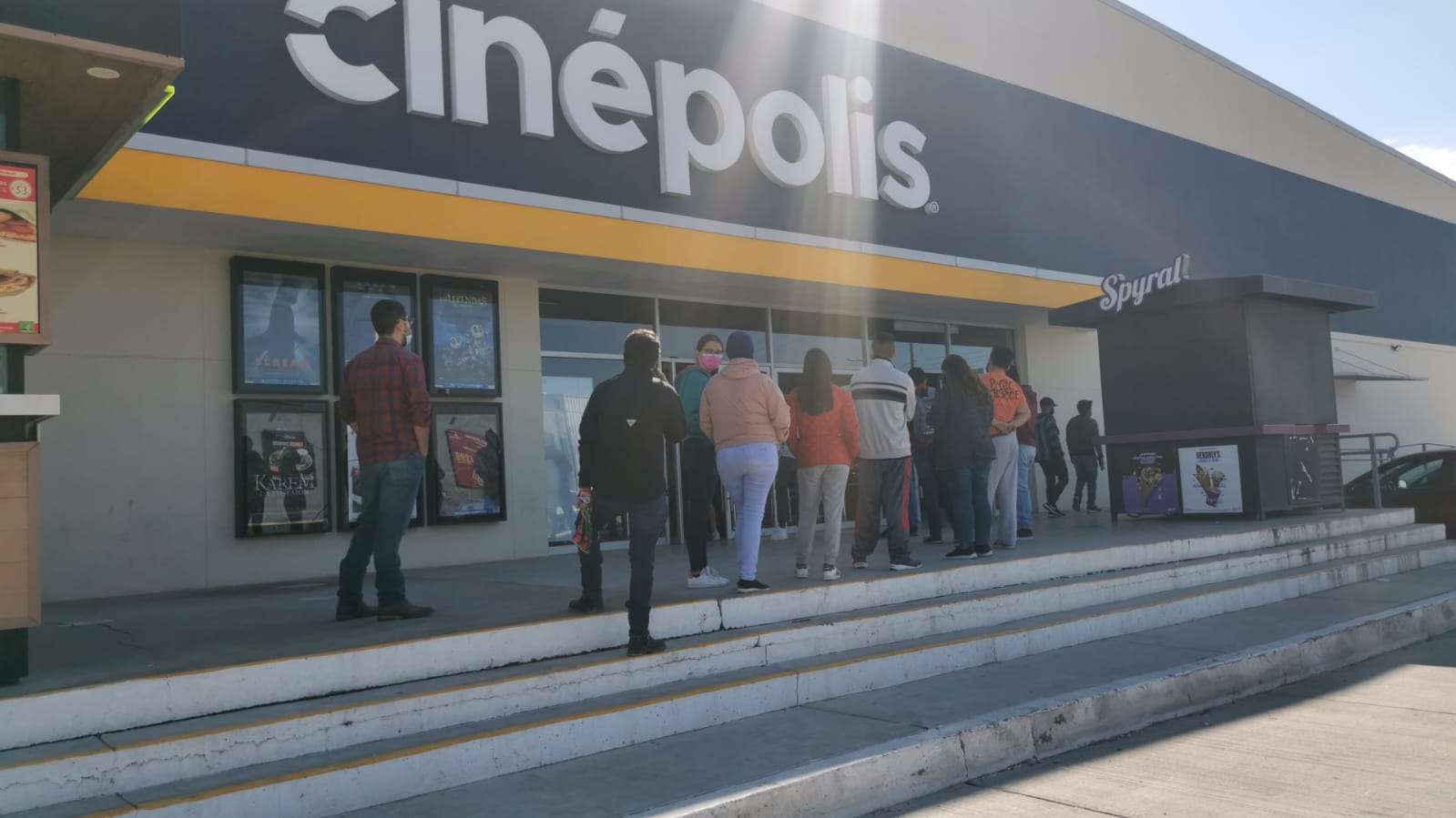 En Cinepolis que se ubica en Gómez Morín Oriente la larga fila se hizo desde temprano y se observó que llegaban hasta afuera del inmueble.