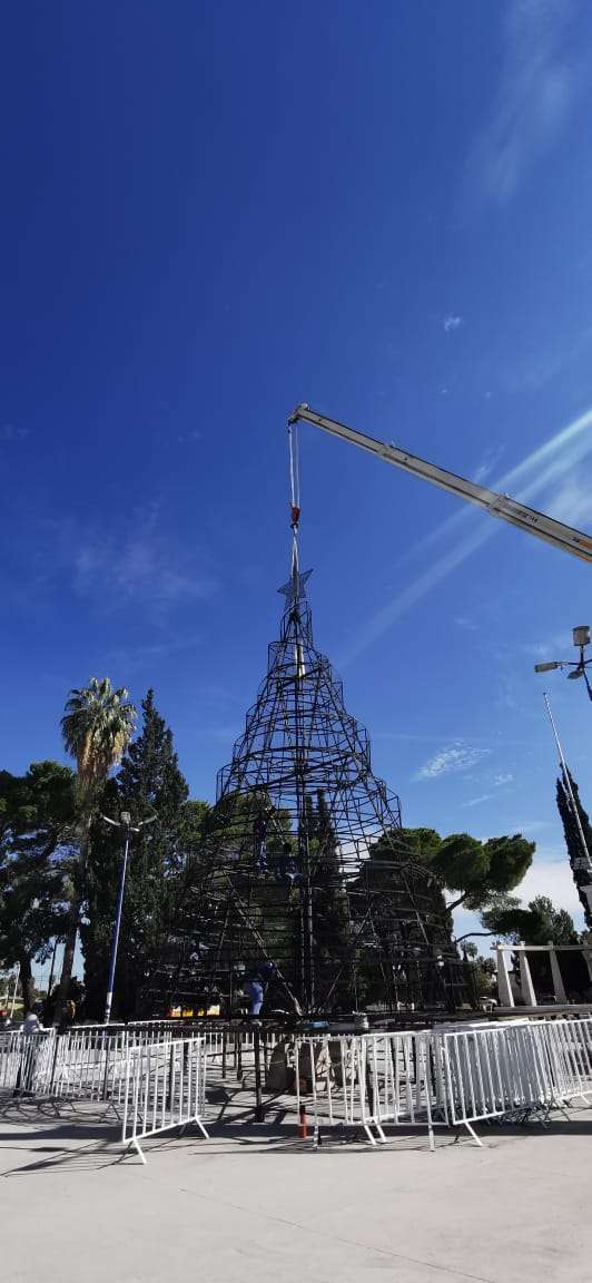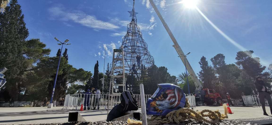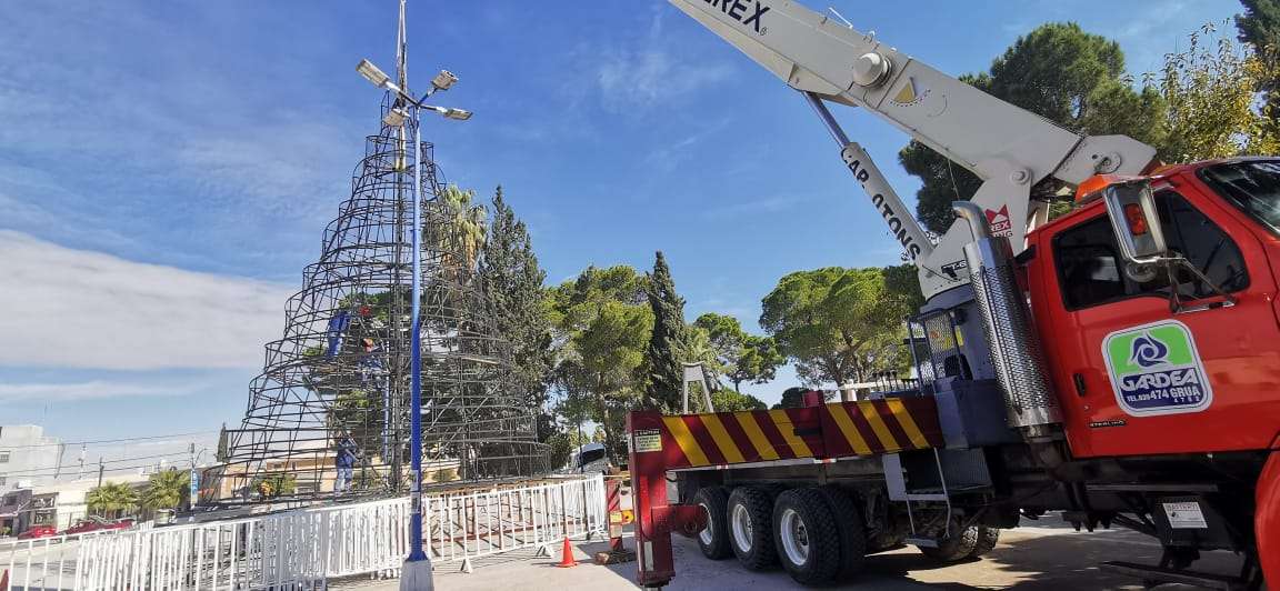 Delicias.- Inició la decoración navideña en el centro y las principales plazas de esta ciudad. Colocaron la estructura del tradicional pino navideño por parte de personal de eventos en conjunto con trabajadores del sindicato al servicio del Municipio.