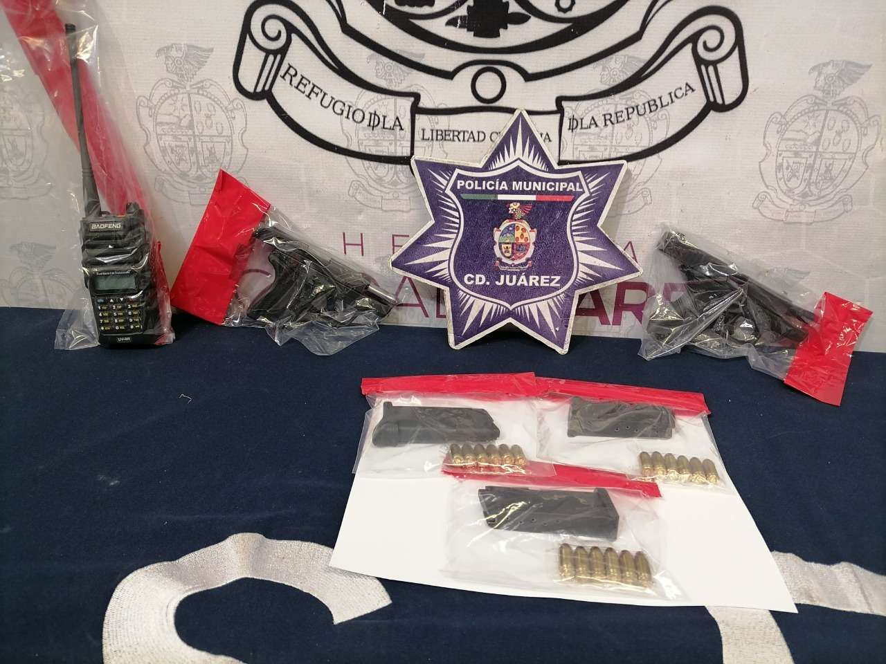Así mismo al momento de su arresto, la víctima hizo entrega a los oficiales de dos armas de fuego calibre .380, tres cargadores abastecidos con seis cartuchos útiles cada uno y un aparato de radio comunicación, propiedad del hoy detenido, los cuales fueron puestos a disposición de la autoridad correspondiente.