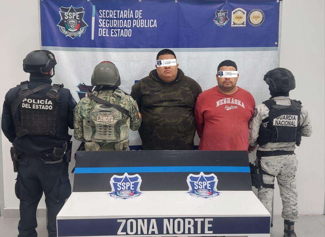 Ciudad Juárez.- Elementos de la Policía de Despliegue de la Secretaría de Seguridad Pública del Estado (SSPE) llevaron a cabo el arresto de Jesús Antonio C. R. y Carlos Gabriel A. A., por su probable participación en el delito de homicidio doloso ocurrido el pasado 17 de febrero, en el que un hombre fue privado de la vida por disparos de arma de fuego al interior de un vehículo en Ciudad Juárez.