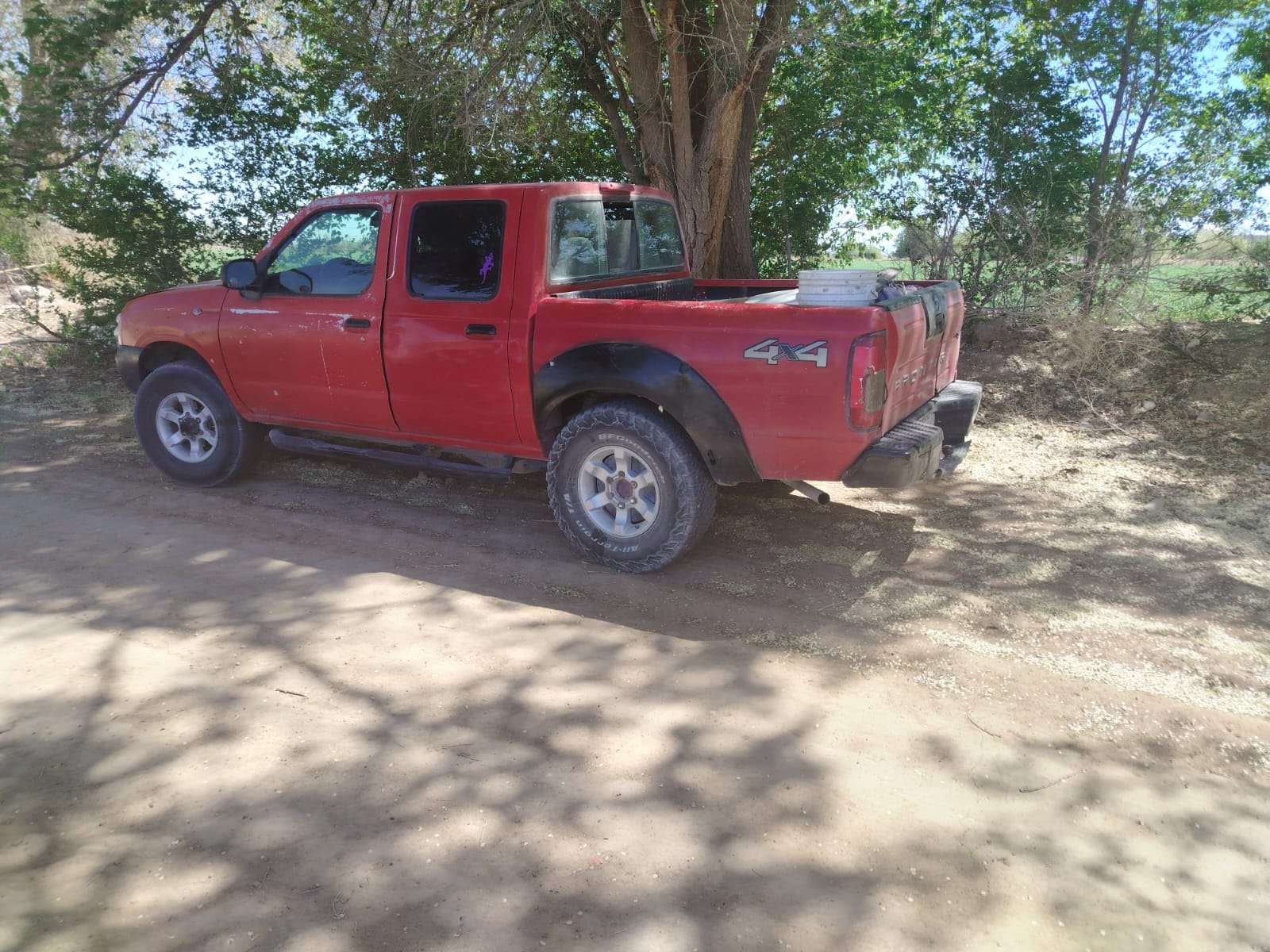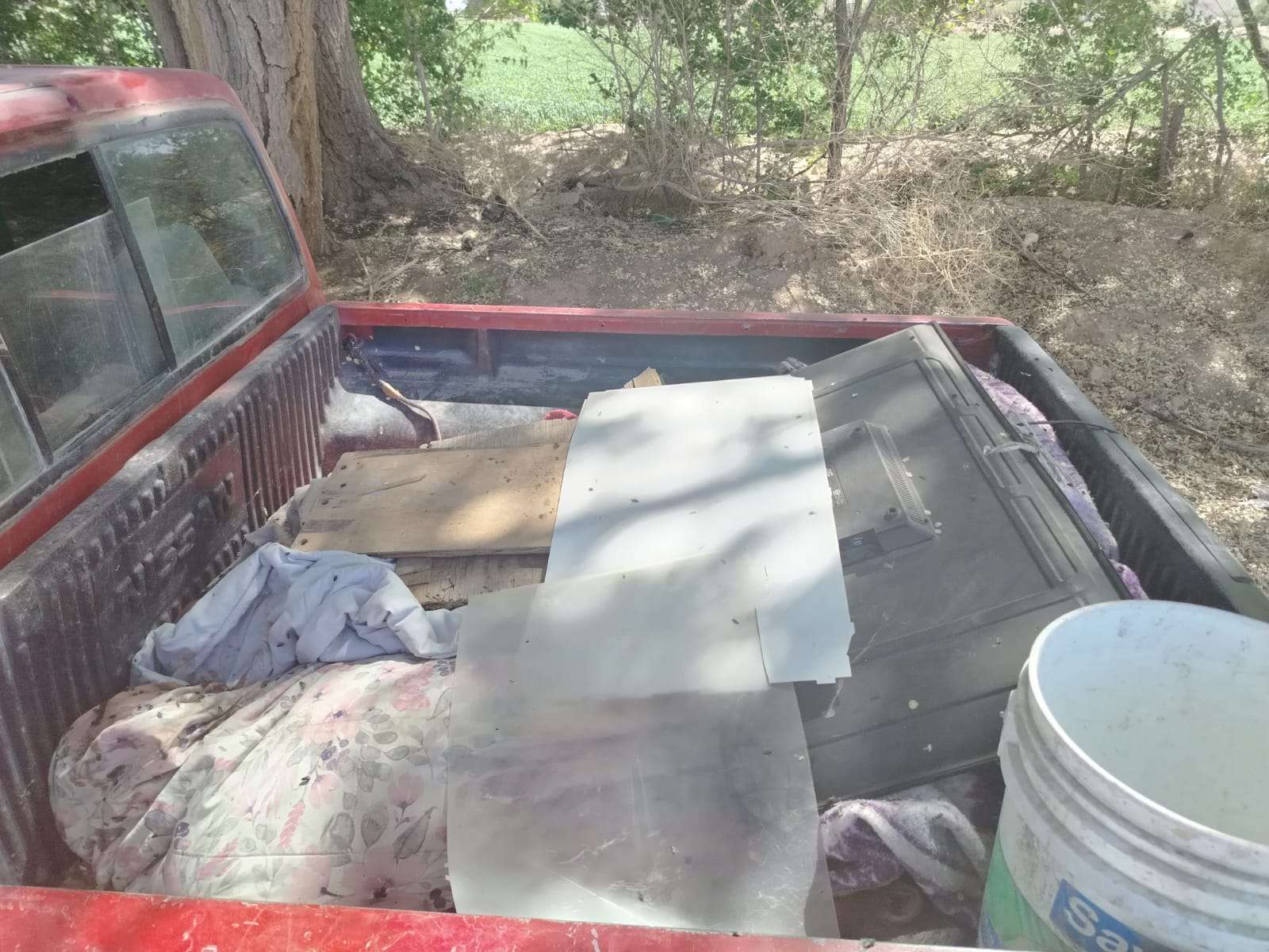 La camioneta roja de modelo antiguo fue abandonada a un lado de El Carril de Caballos que se encuentra a la entrada del poblado de San Isidro.