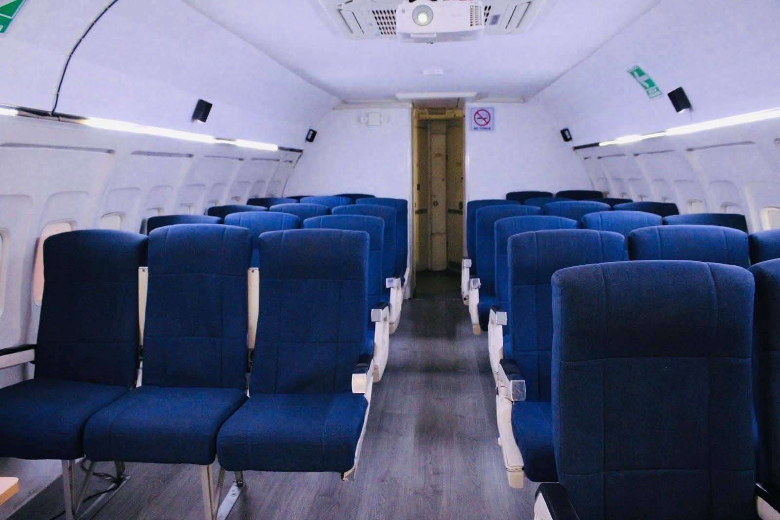 El fuselaje alberga libros digitales, material audiovisual sobre aviación y áreas diseñadas para que los visitantes puedan ingresar a la cabina, conocer los instrumentos de mando y tomarse fotografías como si fueran pilotos.