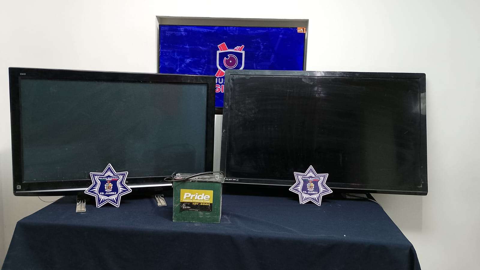 Al arribar al lugar, los oficiales se entrevistaron con la víctima quien señaló a tres sujetos a los cuales sorprendió en el patio de su vivienda, mismos que cargaban en sus manos dos televisores y una batería automotriz por lo que ante el señalamiento directo procediendo con su detención.