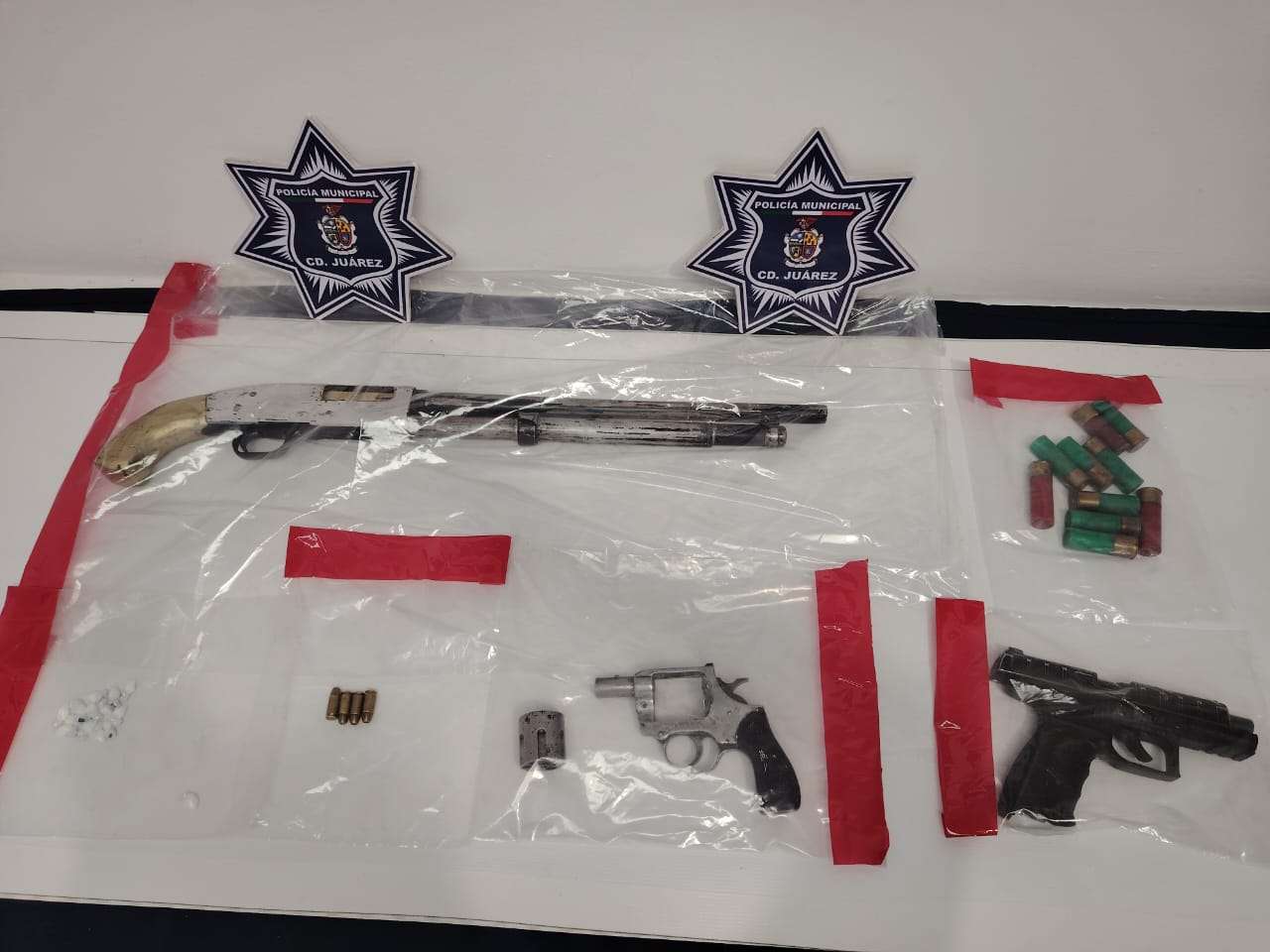 Posteriormente, los oficiales se percataron que en el mismo inmueble se encontraban dos sujetos más y una mujer, a quienes, tras una inspección preventiva, les localizaron un arma de fuego tipo revólver calibre 38, desabastecida, una escopeta calibre 12, diez cartuchos expansivos, cuatro cartuchos útiles calibre 9 milímetros y 15 envoltorios de cristal con un peso de 5.98 gramos.