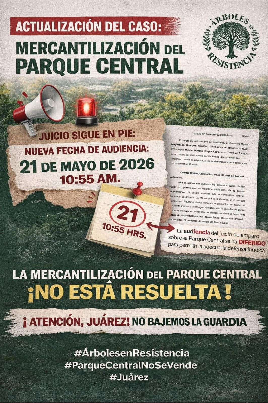 Ciudad Juárez.— El proceso legal en defensa del Parque Central continúa en curso luego de que el Juzgado Sexto de Distrito en el Estado de Chihuahua determinó diferir la audiencia constitucional correspondiente al Juicio de Amparo 229/2026.