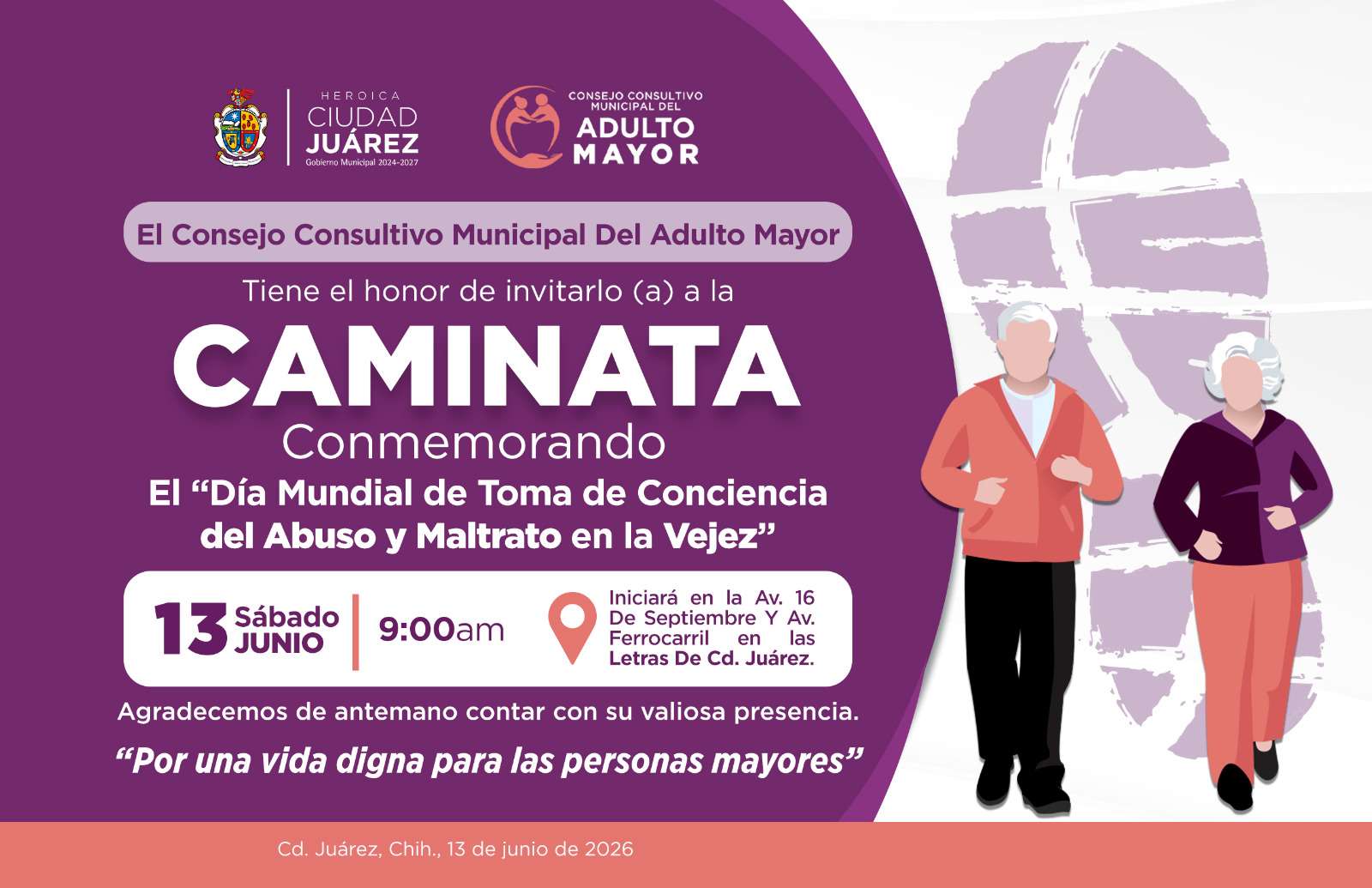 Ciudad Juárez.- El Consejo Consultivo Municipal del Adulto Mayor (CCAM), llevará a cabo el próximo sábado 13 de junio la caminata de concientización, en el marco del Día Mundial de Toma de Conciencia del Abuso y Maltrato a la Vejez.