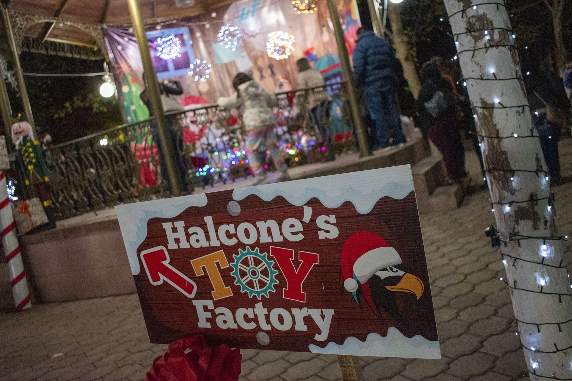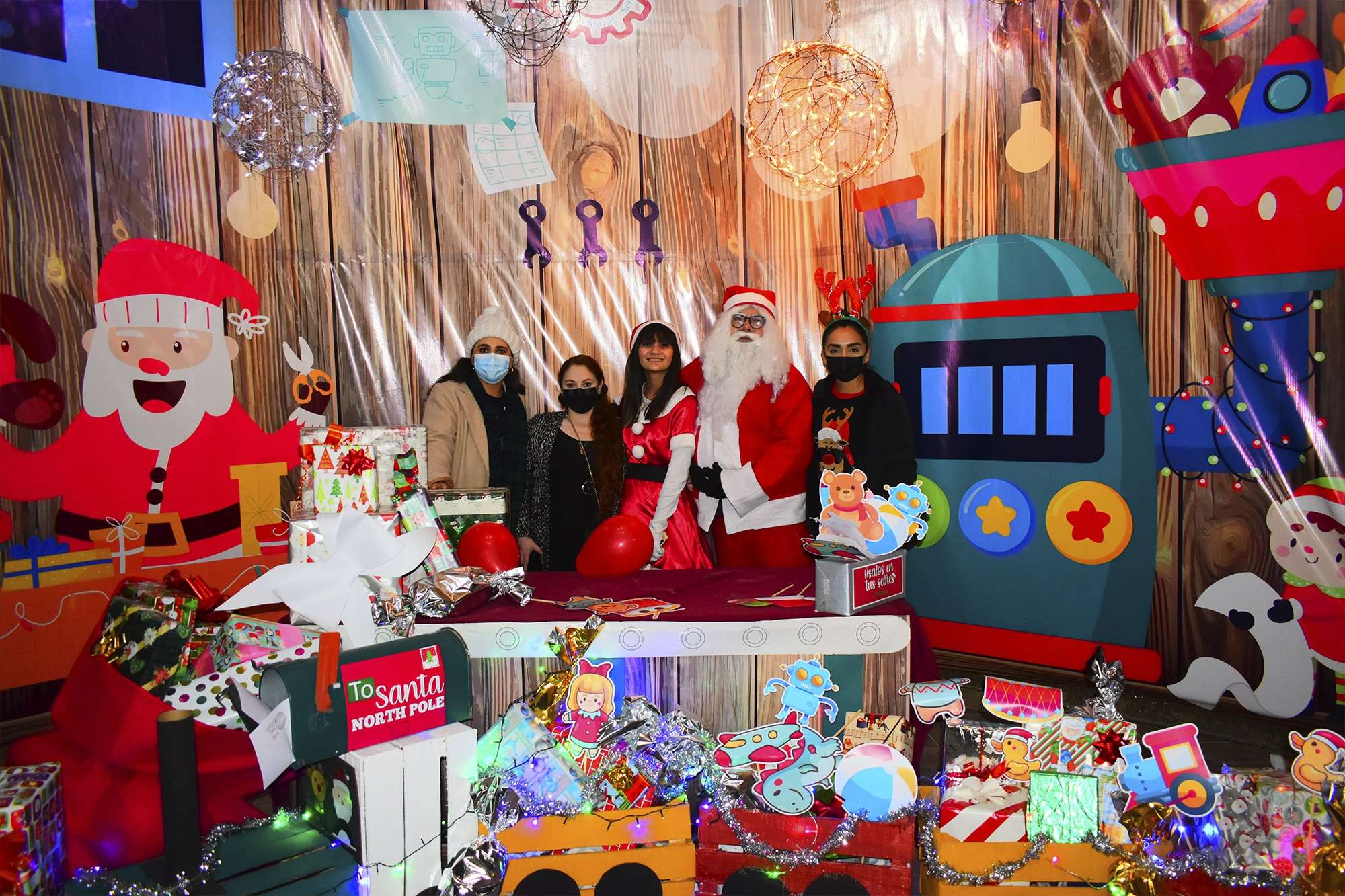 En representación de la familia universitaria “Halcones” de la UT Paquimé montó un stand fotográfico simulando la fábrica de Santa Claus, denominada “Halcone’s Toy Factory”, con el objetivo de que las familias asistentes pudieran tomarse la fotografía del recuerdo con Santa Claus y su ayudante.