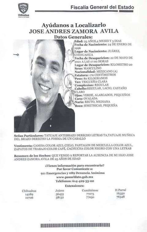 Juárez.- Piden la ayuda de la ciudadanía para localizar a José Andrés Zamora Ávila que desapareció el pasado 22 de mayo del año en curso en Ciudad Juárez.