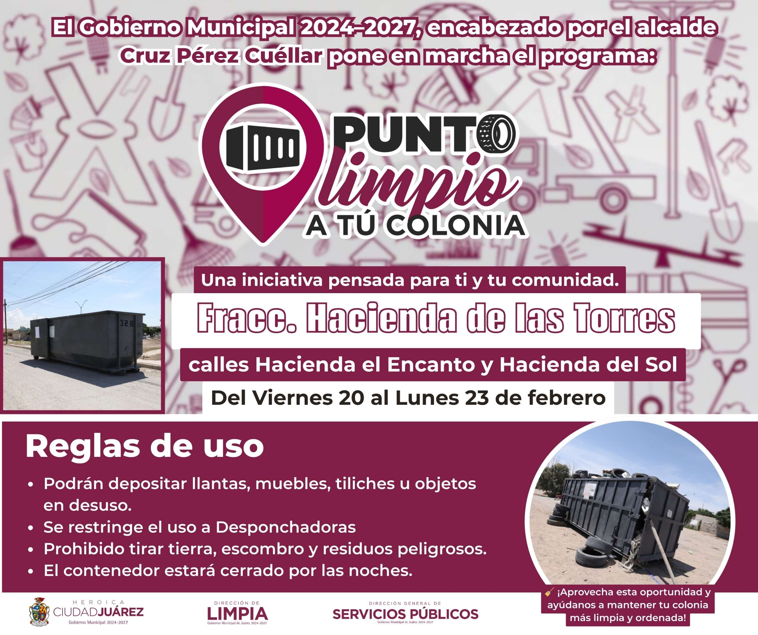 Ciudad Juárez.- La Dirección de Limpia instaló desde ayer y hasta el lunes 23 de febrero, “Puntos Limpios a tu Colonia”, con el objetivo de acercar a los vecinos espacios adecuados para la disposición de tiliches y residuos de gran volumen.