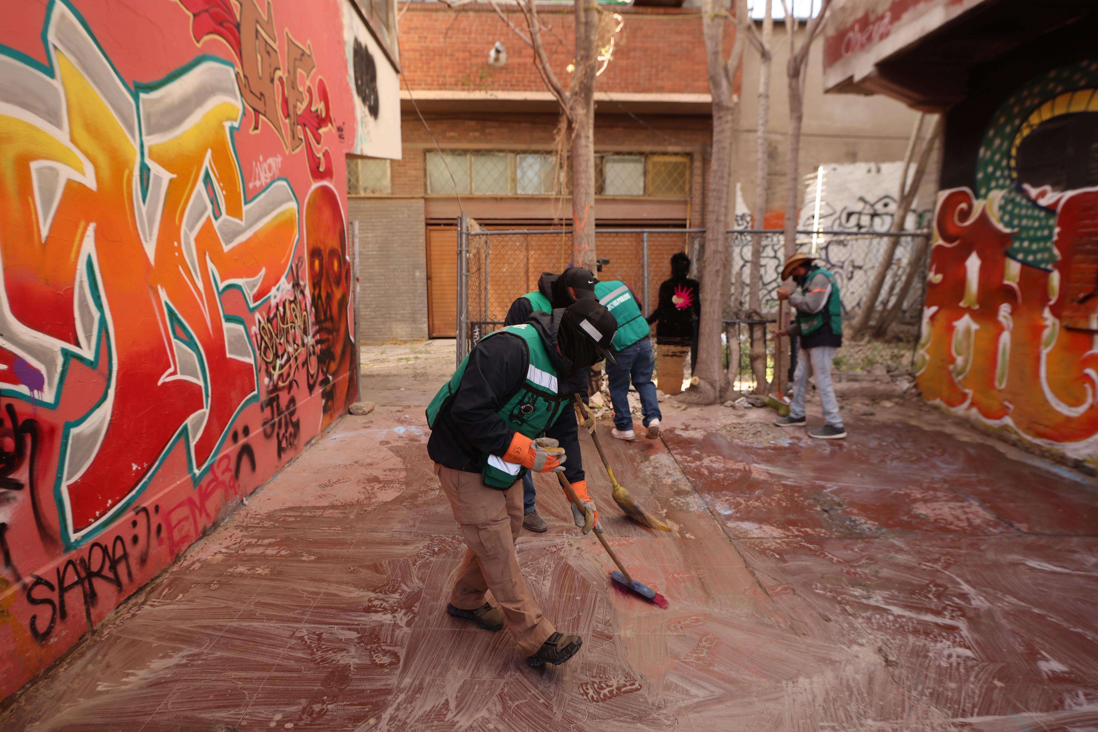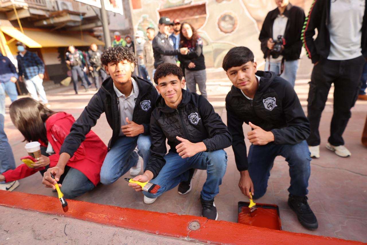 Ciudad Juárez.- Como parte de las acciones para fortalecer el tejido social y mejorar el entorno urbano, el Gobierno Municipal de Ciudad Juárez, encabezado por el Presidente Municipal, Cruz Pérez Cuéllar, llevó a cabo una jornada del programa “Juárez Amanece Limpio” en la Plaza Cervantina, con la participación de ciudadanía, colectivos culturales y el FC Juárez.