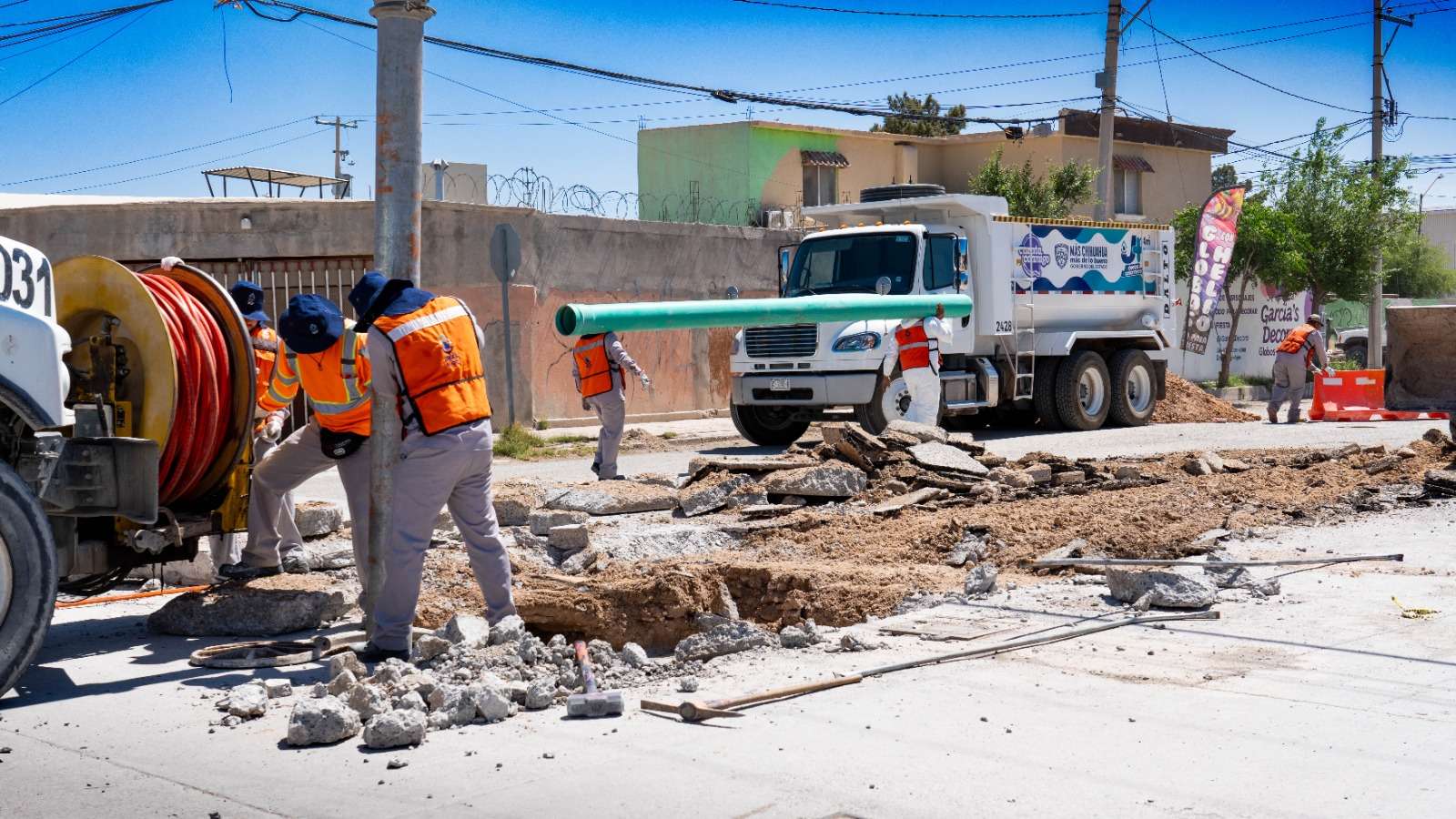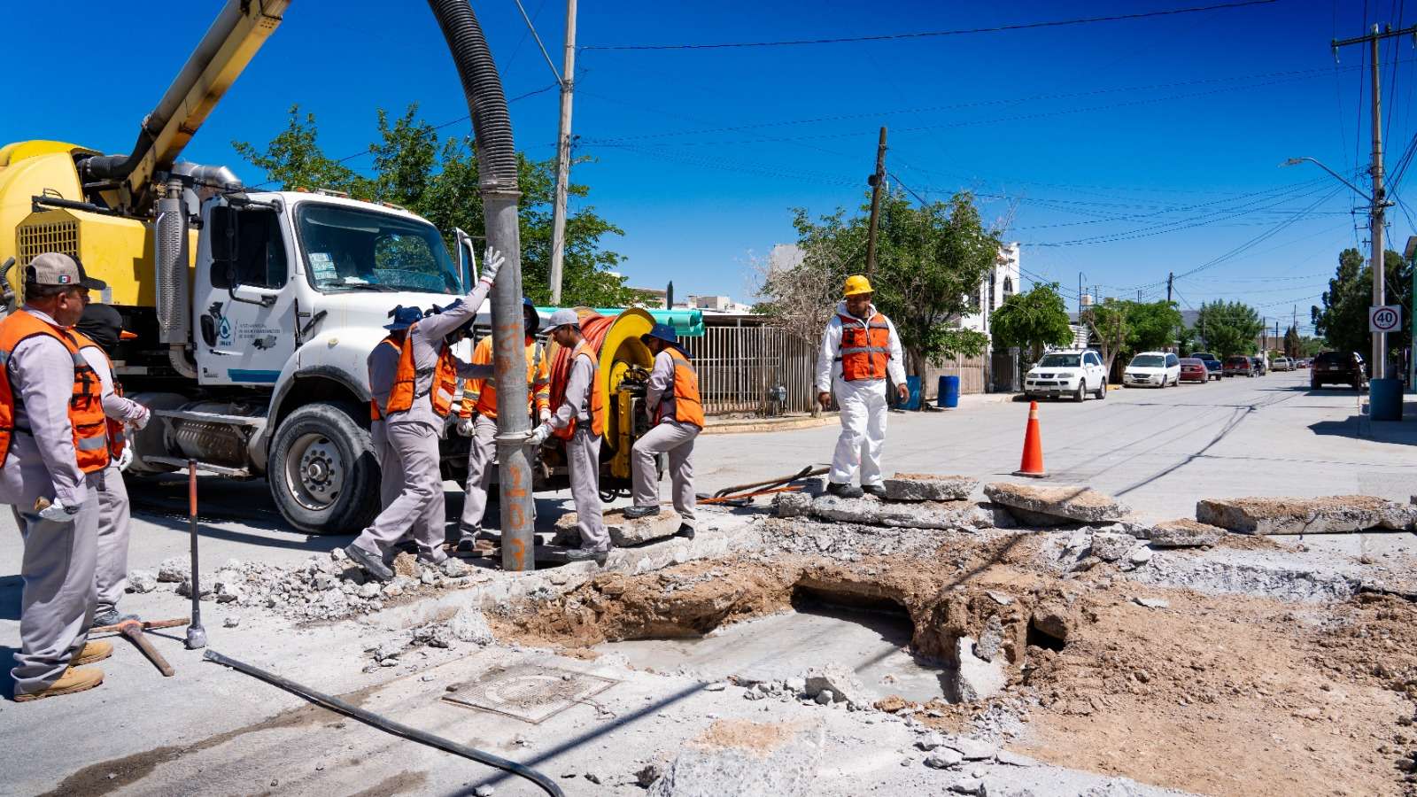 Ciudad Juárez.- La Junta de Agua y Saneamiento de Juárez, a través del departamento de alcantarillado, trabaja en la reparación de un hundimiento registrado en el cruce de las calles Aviación y Hangar, en el fraccionamiento Jardines del Aeropuerto.